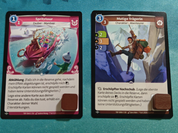Natürlich führt das zweite Set auch jede Menge Karten ein, welche andere Karten gezielt in den erschöpften Zustand versetzen. Sogar Wahrzeichen können jetzt erschöpft werden. Und damit das Erschöpfen auch wirklich spannend wird, gibt es nun Effekte, die gezielt mit erschöpften Karten interagieren. Einige Effekte belohnen, wenn bestimmte Karten erschöpft sind, z. B.: „Wenn eine erschöpfte Karte in deiner Reserve liegt, erhält diese Expedition +1 Energie“. Andere Effekte bestrafen, wenn Karten erschöpft sind, z. B.: „Wenn ein erschöpfter Charakter in dieser Expedition liegt, verliert diese Expedition einen Aktionspunkt“.