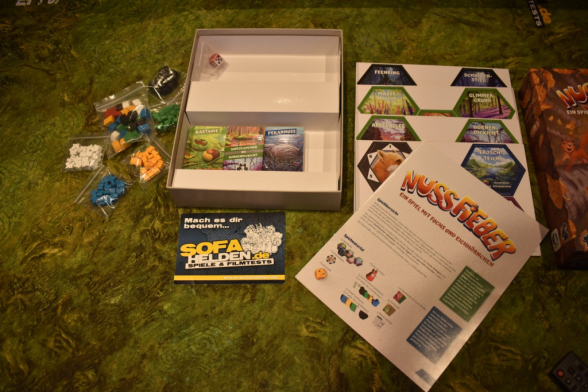 Zwölf Seiten umfasst die Anleitung zu NussFieber. Drei Seiten davon sind der Spielverlauf, zwei der Aufbau und zwei die Endwertung. Hinzu kommt ein Solomodus, der ebenfalls zwei Seiten in Anspruch nimmt. Neben den FAQ und der Spielübersicht bleibt nun noch eine Seite für Begriffserklärungen. Diese ist gut gemeint, aber unserer Meinung nach auch eine kleine Schwäche der Anleitung, denn teilweise sind die Begriffe ein wenig verwirrend am Anfang.