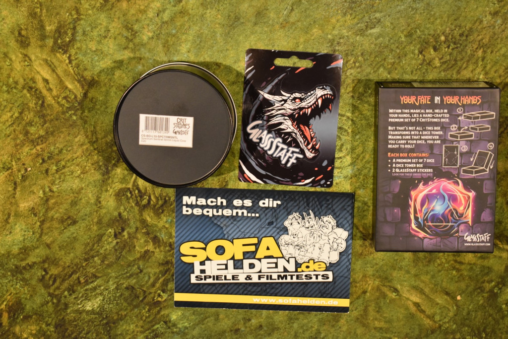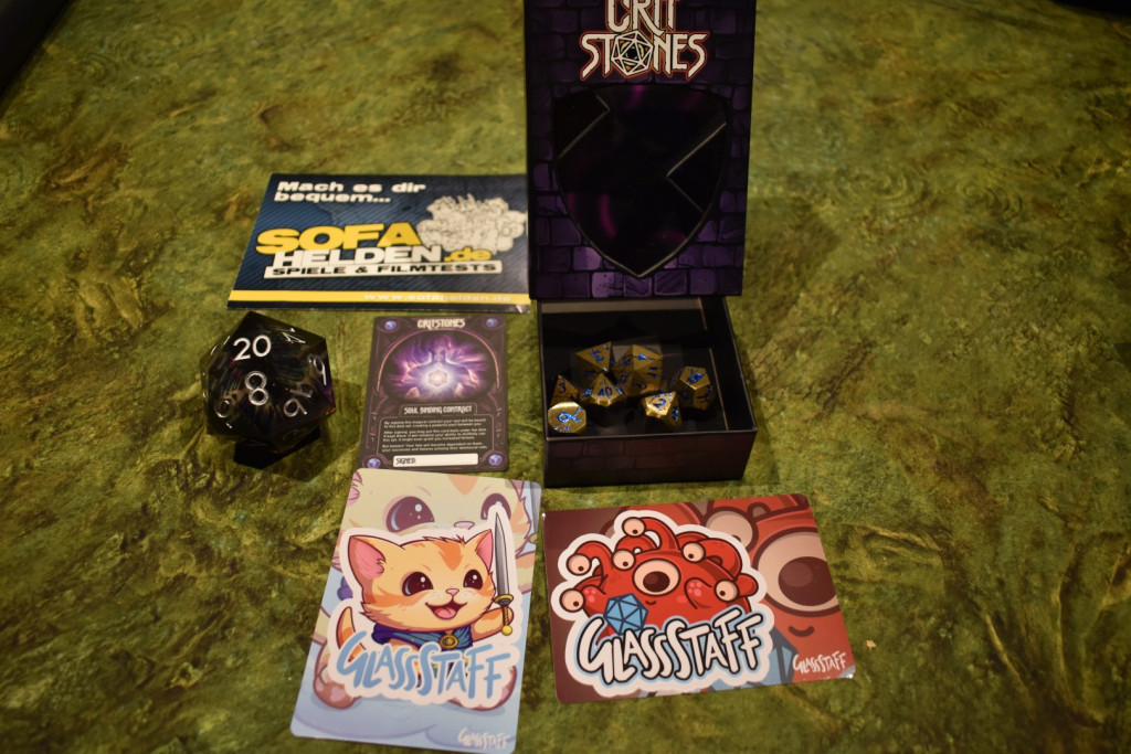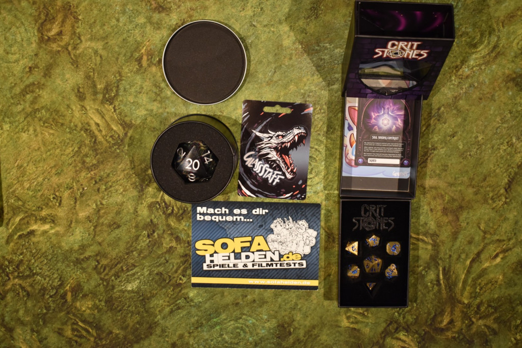 Bereits auf der Spielwarenmesse 2025 stach uns der Stand von Glassstaff ins Auge. Schuld daran waren vor allem die Dice Trays und Arenas mit Drachenkonterfeit in verschiedenen Farben. Aber bei genauerer Betrachtung fielen uns auch die zahlreichen Würfelvariationen aus Metall auf. Hier besonders die zerstörerisch anmutenden Bane Würfel, bei denen man vermutlich auch Angst um seinen Tisch hat, wenn gewürfelt wird. Insgesamt schon alles ziemlich cool, aber wenn man kein Dungeons and Dragons spielt, ist sowas eigentlich der Overkill. Nachdem wir nun aber bei den Chroniken von Drunagor immer wieder das Problem hatten, das da ein W20 für vier Personen einfach zu wenig ist, dachten wir uns, wir starten mal einen Test der Würfel. Ob die Crit Stones getauften Würfel bei uns auch kritisch punkten konnten, erfahrt Ihr in unserem Review…