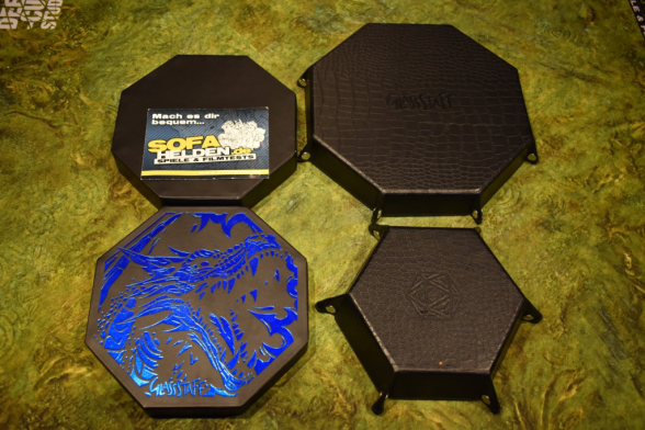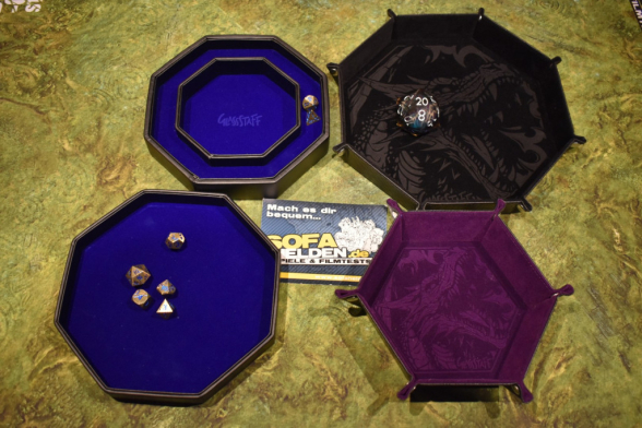 Auf dem Teststand stehen: Ein XL Foldable Dice Tray, eine Dice Arena, ein Sundered Spells Metal RPG Dice Set und ein Spectrum Sentinel 50mm Liquid Core D20. Gut, klingt erstmal alles nach Fachchinesisch. Fangen wir mit dem Dice Tray und der Dice Arena an. Ersteres wird im flachen Zustand ausgeliefert und lässt sich mit den Druckknöpfen zu einem Würfelbehälter zusammendrücken. Außen mit Kunstleder versehen, innen mit Samt, wirkt es sehr wertig und stabil. Der Zusammenbau gestaltet sich gerade am Anfang etwas fummelig. Dank der Druckknöpfe lässt es sich aber auch gut wieder auseinandernehmen, sodass man es im flachen zustand verstauen oder mitnehmen kann. Anders ist es bei den Dice Arenas. Sie sind starr und bestehen aus sehr robustem Karton, der teilweise ebenfalls mit Kunstleder überzogen ist. Innen befindet sich ebenfalls Samt. Die Besonderheit hier ist, dass man den samtverkleideten Deckel als Würfelarena benutzen kann, aber auch den unteren Teil. Dieser ist sogar in zwei Bereiche geteilt. Den äußeren, in dem die Würfel im „Ruhezustand“ aufbewahrt werden können, und den inneren, in dem man würfeln kann. Praktisch ist hier, dass man seine Lieblingswürfel und gegebenenfalls weitere Accessoires gut und geschützt transportieren kann.