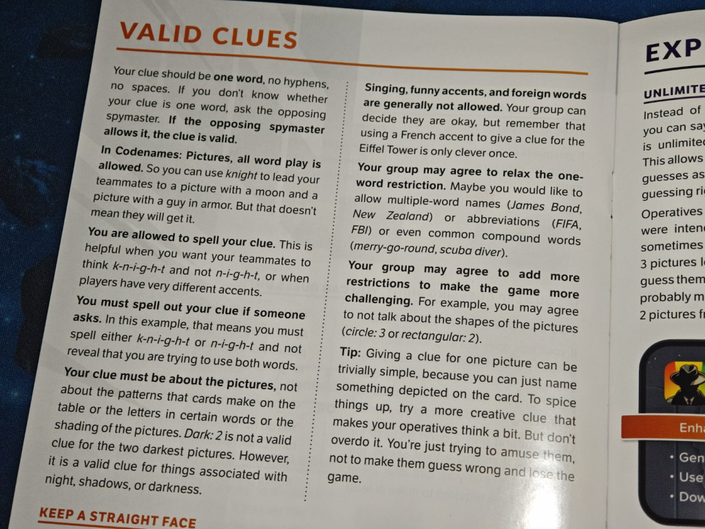 Was bereits in der neuen Auflage der Original- und Duett-Variante verbessert wurde, findet man auch bei Codenames Pictures: das Artwork hebt sich durch orange-violett-Töne stark von dem der anderen beiden Varianten ab. Die Schachtel enthält ein Plastik-Inlay, in dem die Komponenten einsortiert werden können. Aber Achtung: das Ganze ist nicht für die vertikale Aufbewahrung im Regal geeignet.