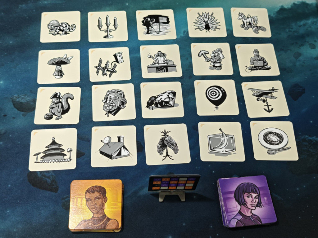 Die Spielvorbereitung verläuft ganz Codenames-typisch: man teilt sich auf in zwei Teams; jedes Team benennt einen Tippgeber, der Rest des Teams muss raten. Dann werden 20 Karten mit Bildern ausgelegt, in einem 5x4 Raster. Das sind also 5 Karten weniger als in den Codenames Wort-Varianten, bei denen ein 5x5 Raster ausgelegt wird.