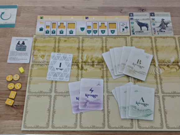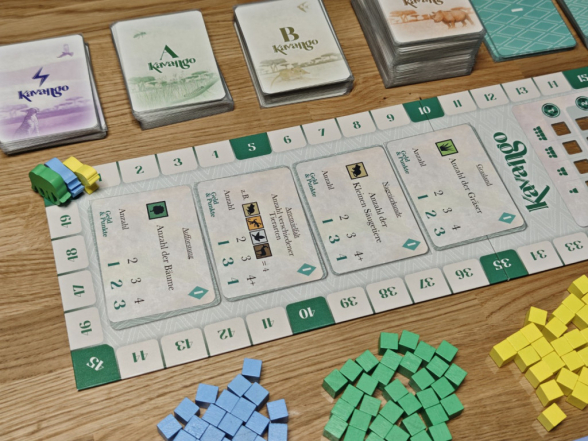 Kavango besteht hauptsächlich aus Karten, richtig vielen Karten. So gehört es sich für ein Drafting Spiel. Und was braucht ein Drafting Spiel noch? Ein Board für die persönliche Kartenauslage. Nun, eigentlich könnte man die gespielten Karten auch einfach auf den Tisch legen, die Anordnung spielt ohnehin keine Rolle. Dennoch hat jeder Spieler sein eigenes Board in Spielerfarbe, mit individuellem Artwork, das Platz für ein Raster aus 3 x 8 Karten bietet. Zusätzlich gibt es ein paar Holzkomponenten, und doppellagige Tableaus, das war’s dann auch schon. Die Schachtel ist bis oben hin voll und die Materialqualität super. Ein paar Upgrades gibt’s allerdings noch in der Kickstarter-Version, z.B. Material für einen fünften Spieler und screen-prints auf den Holz-Meeplen. Ob man das braucht, muss jeder selbst entscheiden.