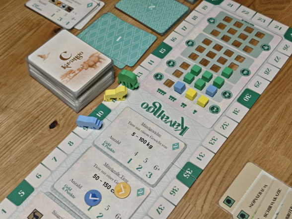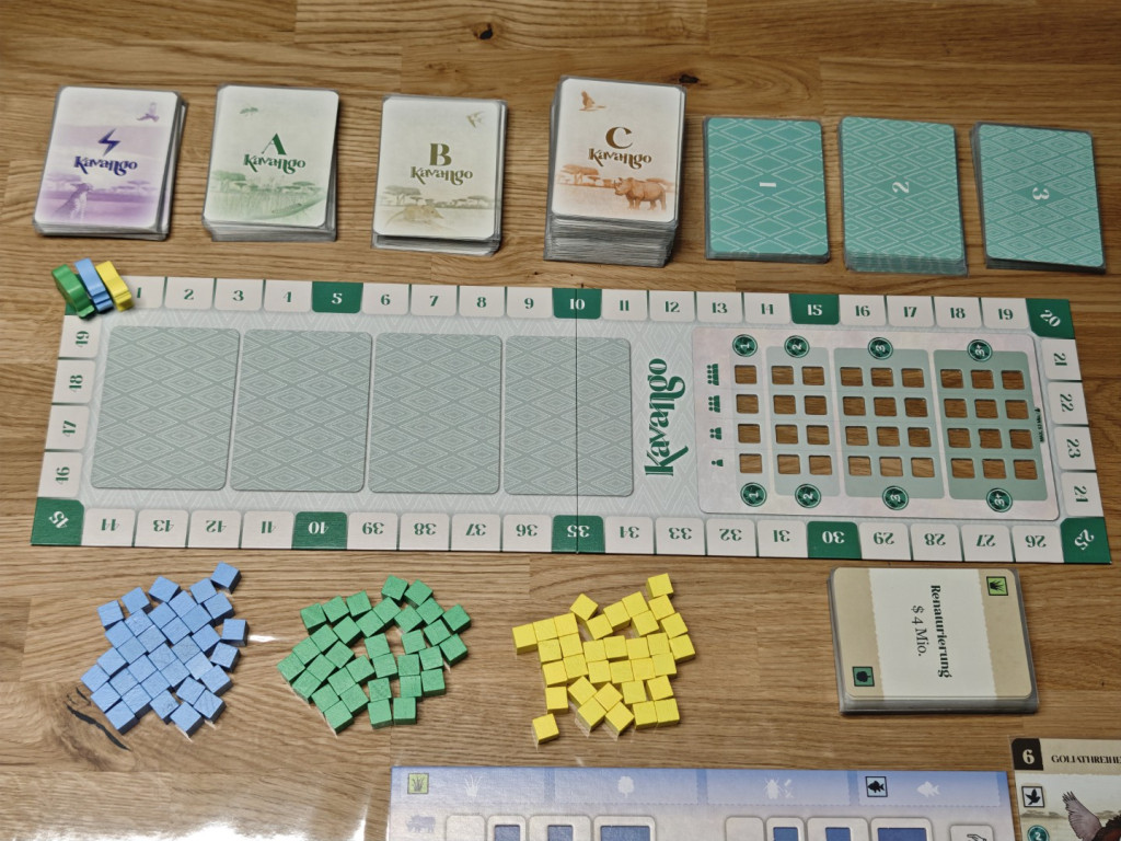 Jeder Spieler nimmt sich nun das Material in seiner Spielerfarbe: grün, orange, blau oder gelb. Dazu gehören die Geldmarker, kleine Holzwürfel. Diese kommen allerdings beiseite, in einen Vorrat, von dem aus man sich bedient, immer dann, wenn man Geld erhält. Man kann mit einem Startkapital von 0-2 Geldmarkern spielen, je nach Lust und Laune. Außerdem nimmt sich jeder Spieler seine Tierfigur, die auf die Siegpunkteleiste des Spielplans platziert wird, zwei Zählchips, die benötigt werden, wenn die Tierfigur die 50 Punkte-Marke knackt, und vier Checkmarker, mit denen man im Spielverlauf erfüllte Forschungsaufträge markiert.