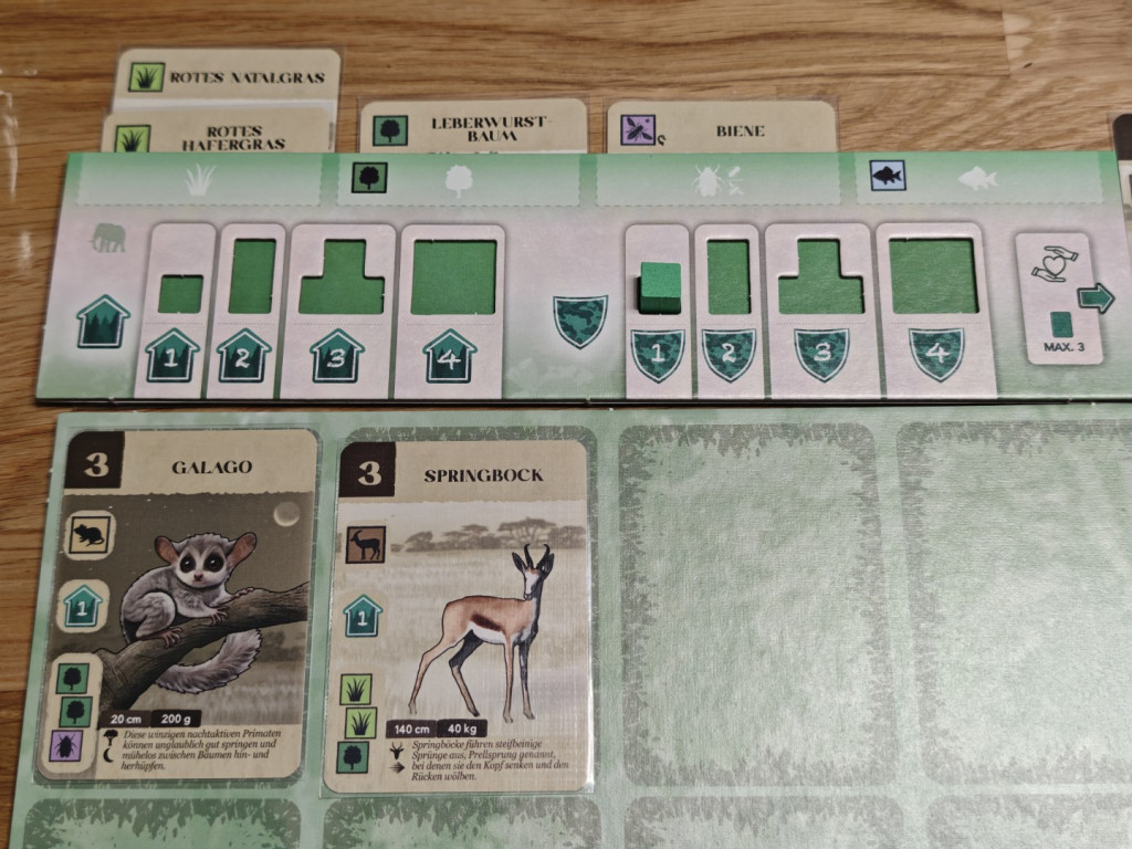 Habitat- und Wildtierschutz funktionieren etwas anders. Hier gibt es jeweils die Schutzstufen 1 bis 4. Um von einer auf die nächste Schutzstufe zu kommen, muss man Geld entsprechend der Schutzstufe investieren, d.h. ausgehend von Schutzstufe 2 kostet das Erreichen von Schutzstufe 3 genau 3 Geld. Man kann hier keine Teilinvestitionen tätigen. Die Geldmarker platziert man in allen Fällen in die entsprechenden Aussparungen des Tableaus bzw. Spielplans. Neben der Erhöhung von Schutzstufen kann man für 4 Geld auch immer eine Renaturierungskarte kaufen, eine alternative Möglichkeit an Produzenten-Symbole zu kommen.
