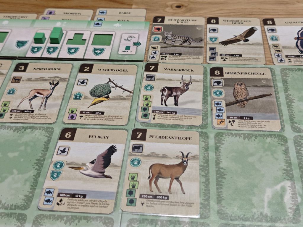 Spielt man eine Wildniskarte aus Deck B oder Deck C, also ein Tier, so muss man zunächst prüfen, ob alle Voraussetzungen erfüllt sind, um das Tier ins eigene Reservat aufzunehmen. Hat man alle Tierarten oder Produzenten in der benötigten Kombination und Anzahl bereits ausliegen, und erfüllt man ggf. die Schutzvoraussetzungen, so darf auch die gespielte Tierkarte ins Reservat aufgenommen werden. Hat man die benötigten Produzenten oder Tiere nicht ausliegen oder erfüllt die Schutzvoraussetzungen nicht, muss die Karte in die Auffangstation. Aber Achtung: hier dürfen nur maximal drei Karten liegen. Sobald zu einem späteren Zeitpunkt alle Voraussetzungen einer Wildniskarte in der Auffangstation erfüllt werden, wandert sie direkt und automatisch ins Reservat, ohne dass hier eine extra Aktion notwendig wäre. Die Auffangstation ist also eine praktische Pufferzone.