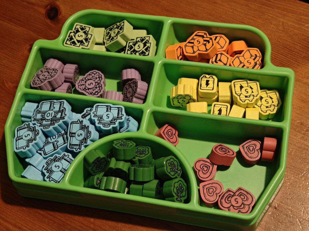Neben dem Spielplan benötigt ihr Platz für die beiden Ressourcen-Trays. Sie enthalten die sechs verschiedenen Ressourcen in Natera: Ausdauer (rotes Herz), Beweglichkeit (hellgrüne Pfeile), Intelligenz (lila Gehirn), Nahrung (blaue Töpfe), Nachschub (orangene Pakete) und Energiezellen (gelbe Batterie). Außerdem findet man in diesen Trays auch die Wachstums-Marker (dunkelgrüner Baum).