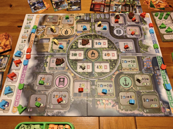 Auf dem Spielplan müssen noch ein paar mehr Vorbereitungen getroffen werden: Die vier Distrikt-Scheiben werden auf die jeweiligen Felder platziert. Sie werden von Spielern beansprucht, wenn sie auf der jeweiligen Autoritätsleiste des Distrikts in Führung gehen. Der Besitzer einer Scheibe erhält zusätzliches Einkommen in den Ruhephasen. Außerdem werden für jede der fünf Kategorien ein zufälliges Anrechtsplättchen ausgewählt und platziert. Diese geben Ziele vor, für die der erste Spieler bei Erreichen ordentlich Siegpunkte erhält. Zuletzt kommt der Rundenmarker – die weiße Uhr - auf Feld 1 der Rundenleiste.