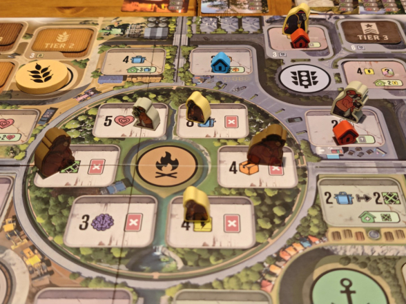 Wie eingangs erwähnt gibt es große und kleine Arbeiter. Die großen Arbeiter sind die Stammes-Anführer. Werden diese auf ein Feld platziert, blockieren sie das Feld für andere Arbeiter. Die kleinen Arbeiter dagegen sind die Erkunder und blockieren das Feld nicht. Es können beliebig viele Erkunder dasselbe Aktionsfeld besuchen. Aber jeder Spieler darf nie mehr als einen Arbeiter auf einem Aktionsfeld stehen haben.