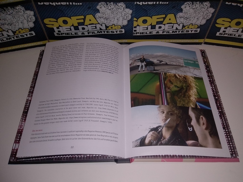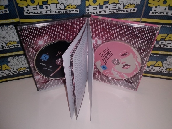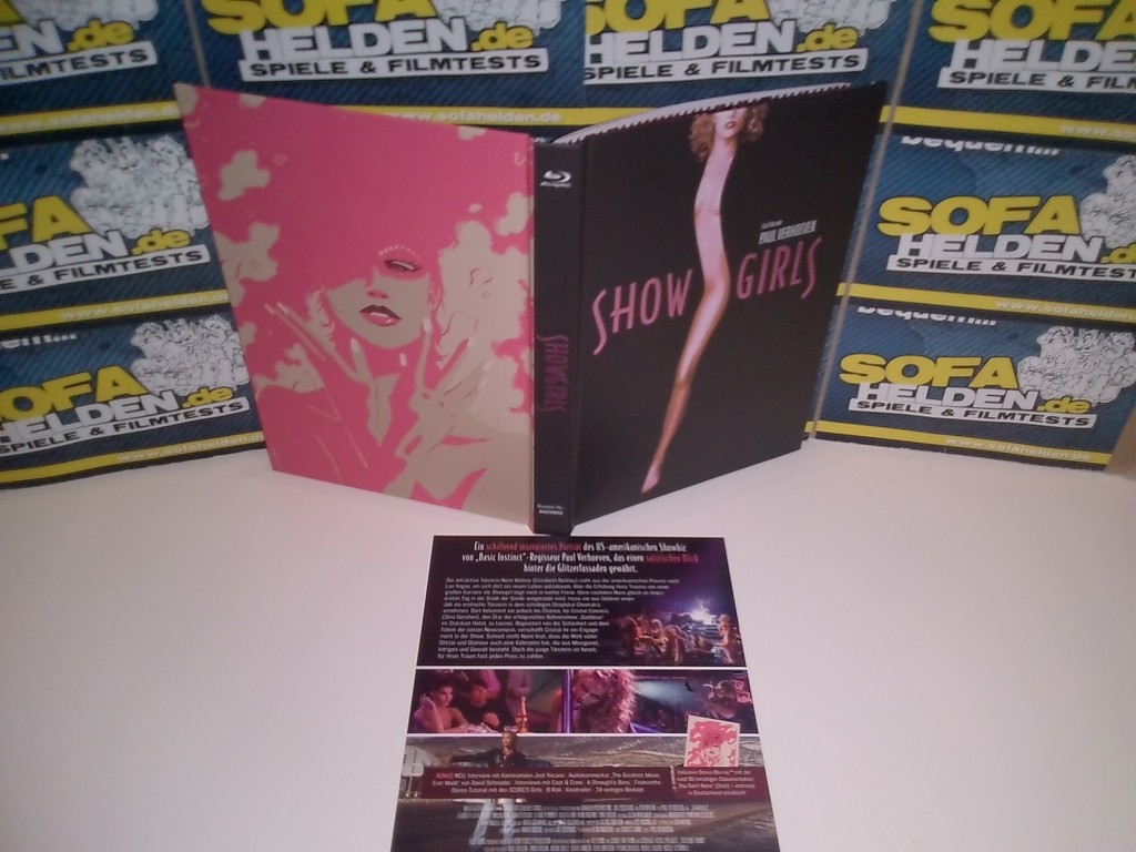 Die Front des Mediabooks zeigt das bekannte Postermotiv von Showgirls in matter Optik, wobei der Titelschriftzug durch Hochglanzoptik hervorgehoben wurde. Dieser stilisierte Schriftzug wiederholt sich auch auf der Spine. Die Rückseite hingegen besteht aus dem Postermotiv der Dokumentation You Don´t Nomi, die sich als Bonus Blu-ray ebenfalls im Mediabook befindet. Das Begleitblatt mit den Infos und Inhaltsangaben zum Mediabook wurde, ganz typisch für die Veröffentlichungen von Capelight, lose auf die Rückseite aufgelegt. Die Blu-ray selbst bietet neben dem Hauptfilm zahlreiche Extras, wie beispielsweise diverse Featurettes und Interviews sowie - erstmals - ein Interview mit Kameramann Jost Vacano. Abgerundet wird die Veröffentlichung durch ein 24-seitiges Booklet, das neben diversen Screenshots und Hintergrundinfos zum Film auch eine ausführliche Biografie Paul Verhoevens enthält, die von zahlreichen Zitaten des Regisseurs begleitet wird. Cover & Bilder © capelight pictures OHG Das Fazit von: MarS