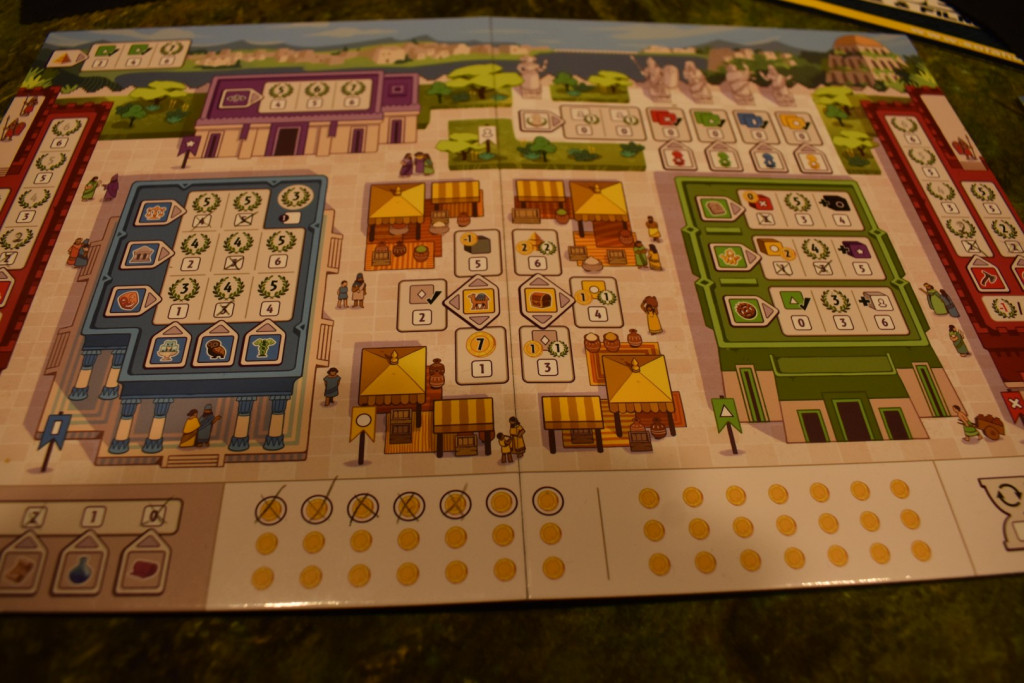 Beim Bauen habt Ihr die Wahl zwischen fünf Gebäuden. Die Agora, der Markt und die beiden Kasernen. Für den Bau dieser benötigt Ihr den Würfel der entsprechenden Farbe mit einem Symbol, das zu Euren Plänen passt. Bei der Agora müsst Ihr die Zeilen und Spalten immer in Pfeilrichtung ankreuzen, immer in der Zeile oder Spalte, die das Symbol des Würfels zeigt. Darüber hinaus erhält die Person, die die Agora als erste vollständig gebaut hat, das Bonuskreuz mit drei Siegpunkten. Auch bei den Kasernen müsst Ihr die Reihenfolge beachten. Entsprechend der Symbole kreuzt Ihr die Spalten von unten nach oben an. Dabei unterscheidet Ihr zwischen Angriff und Verteidigung. Greift Ihr mit der Kaserne-West die Person links von Euch an, prüft Ihr, wie viele Kreuze sie bei Ihrer Verteidigung gesetzt hat. Diese zieht Ihr von Euren soeben angekreuzten grauen Siegpunkten ab und schreibt das Ergebnis in das Feld. Ebenso verhält es sich mit der Kaserne-Ost und der Person rechts von Euch. Der Markt ist frei ankreuzbar, sofern Ihr das mit dem Feld gewürfelte Symbol habt. Er bringt Euch Sofortboni, aber auch Siegpunkte am Spielende. Das letzte Gebäude ist die Akademie. Hier könnt Ihr neben weiteren Boni die drei übrigen Würfel für Euch freischalten. Wichtig ist dabei, dass durch diese Spezialwürfel jeweils ein grauer Ressourcenwürfel entfernt wird. Dadurch erhalten die Anderen weniger Ressourcen und nur die Personen, die die Spezialwürfel angekreuzt haben, dürfen diese auch verwenden. Sie geben euch die Möglichkeit, die Gildenhalle und die Ehrengalerie zu bauen. Hierfür müsst Ihr beim lila Würfel bestimmte Bedingungen erfüllen, wogegen Ihr bei der Ehrengalerie wieder nur Symbole benötigt. Der schwarze Würfel ist hingegen nur dafür da, dass Ihr ein Feld im angezeigten Gebäude ankreuzen dürft.