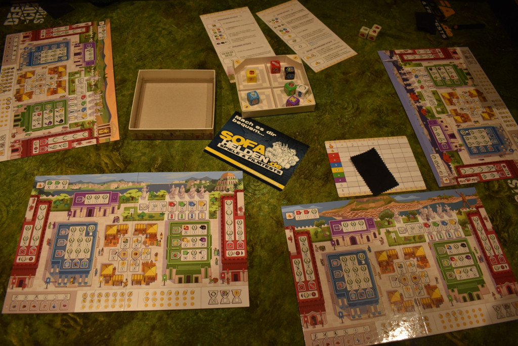 Wie bereits erwähnt, haben wir keinerlei Erfahrungen mit 7 Wonders, daher können wir hier keinen Vergleich ziehen. Beim asmodee Presseevent spielten wir die erste Partie mit einem Pärchen, das 7 Wonders schon kannte. Bei den beiden haben wir gemerkt, dass es für erfahrene Spieler nicht so einfach ist, die Unterschiede zum Grundspiel zu verstehen. Apropos verstehen: Das Spiel an sich ist echt super. Es ist nicht sonderlich schwer, hat keine Plastikstifte oder Abreißblöcke und macht einfach Spaß. Aber die Anleitung ist in unseren Augen unvollständig. Gerade die Kaserne ist nicht ausreichend erklärt und die Kreuze bei den Bonusfeldern müssten auch etwas präziser erklärt werden. Auch der Widerspielwert ist relativ hoch, da durch die Würfel jede Runde anders ist und - das wird Vielspieler freuen - die Tableaus sind alle unterschiedlich. Trotzdem scheint das Balancing zu passen. Am Ende kommen wir so auf eine sehr gute Wertung von 8 Punkten, bei denen die Anleitung bereits einen Punkt gekostet hat.