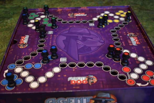 Ansonsten ist alles wie beim Original. Ihr kämpft Euch nach vorne, benötigt Rauskommen-Karten, um Eure Figuren ins Spiel zu bringen und dürft auf den Zielfeldern weder schlagen noch überspringen. Wichtig zu erwähnen ist noch die Spieldauer. 45 Minuten sind schon arg kurz und wahrscheinlich nur möglich, wenn man eher friedfertig oder ohne groß nachzudenken spielt. Agent Dog ist sehr taktisch, weshalb man einfach nachdenken muss und dank der untergetauchten Figuren teilweise auch seinen zuvor überlegten Zug noch einmal neu überdenken muss. Wir haben für unsere Runden im Schnitt zweieinhalb Stunden gebraucht. Gerade wenn die „brennende vier“ zum Einsatz kam, wurden die Karten quasi neu gemischt und es war wie ein Neustart.