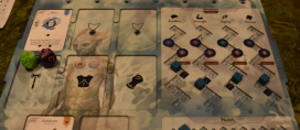 Sobald Ihr an der Reihe seid, spielt Ihr in der Bewegungsphase eine Eurer Handkarten. Jede Karte zeigt Euch an, wie viele Eurer Figuren Ihr bewegen dürft und wie weit Ihr mit jeder dieser Figuren laufen dürft. Bewegen dürft Ihr Euch jeweils auf orthogonal angrenzende Felder, außer bei einer Sonderkarte, die Euch explizit anweist, diagonal zu laufen. Außerdem gibt es noch eine Karte, bei der Ihr gegnerische Figuren bewegen müsst. Darüber hinaus gibt es noch Karten für den Kampf, für das Bewegen sowie Auslösen des Eliminators. Die Karten werden im Prinzip von oben nach unten ausgeführt. Als erstes lauft Ihr. Dabei kann es passieren, dass Ihr am Ende auf einem Feld landet, auf dem schon fünf Figuren stehen. Ist das der Fall, schubst Ihr eine Figur Eurer Wahl auf das nächste benachbarte Feld in Eurer Bewegungsrichtung. Ist dort ein Loch, so fällt sie runter und Ihr erhaltet die Figur als Beute. Wenn Ihr den Eliminator bewegt, dürft Ihr ihn in eine beliebige Richtung (orthogonal oder diagonal) an ein angrenzendes Feld bewegen (kein Loch und nicht die Mitte). Löst Ihr ihn aus, drückt Ihr den Knopf. So fliegt ein Plättchen mit Figuren nach oben. Nun müsst Ihr gucken, wo die darauf befindlichen Figuren gelandet sind. Alle Figuren, die runtergefallen sind, werden in die Schachtel gelegt, alle Figuren, die auf einem Feld gelandet sind, werden dort wieder aufgestellt. Wenn Eure Karten die überkreuzten Schwerter zeigen, beginnt der Kampf. Hierbei prüft Ihr alle Felder einzeln auf Mehrheiten. Diese Farbe darf eine beliebige der anderen Figuren ausschalten und die Figur als Beute nehmen.