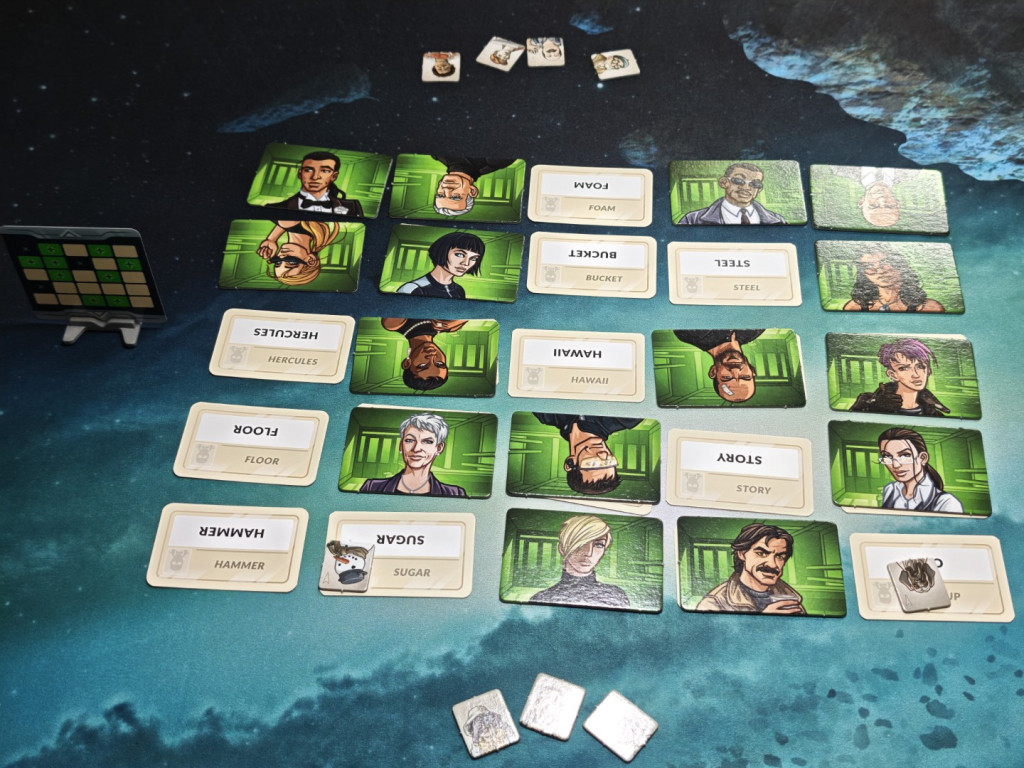 Wie unterscheidet sich nun die Spielvorbereitung? Wie auch im Original wird ein 5 x 5 Raster aus Wortkarten ausgelegt. Daneben kommen die 15 grünen Agenten-Plättchen, das Assassinen-Plättchen und (statt der Plättchen für Unbeteiligte) die 9 kleineren Zeit-Plättchen, welche auf der Rückseite Unbeteiligte zeigen.