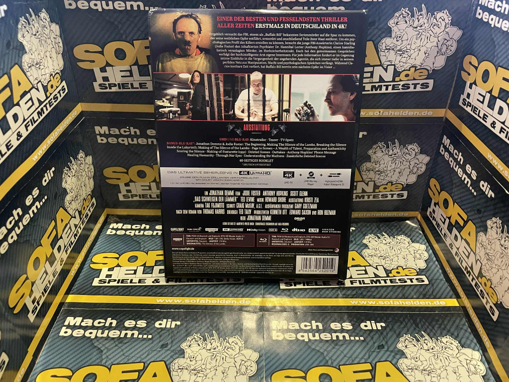 Capelight hat sich für zwei Covervarianten entschieden. Cover A zeigt das ikonische Kinoplakat mit Jodie Foster und dem Totenkopfschwärmer über ihrem Mund, veredelt mit einem Glanzeffekt auf Titel und Motiv. Auf der Rückseite befindet sich eine Filmszene, während die Details auf einer losen J-Card stehen. Im Inneren sind ein 50-seitiges Booklet mit Bildern und einem Text von Alexandra West sowie die 4K-UHD und beide Blu-rays (Film und Extras). Cover B ist exklusiv im Capelight-Shop erhältlich und zeigt Anthony Hopkins und Jodie Foster gemeinsam – natürlich ebenfalls mit dem markanten Totenkopfschwärmer.
