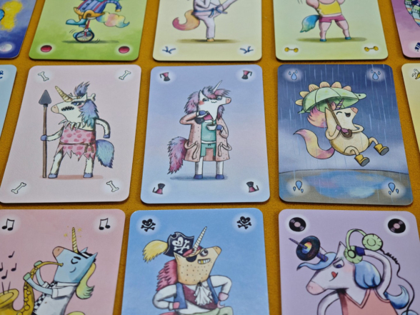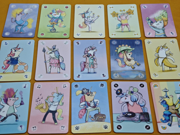 Nachdem man seine sechs Handkarten gesichtet hat, darf man sofort alle Pärchen – also jeweils zwei Karten mit demselben Motiv – in die persönliche Auslage ablegen. Der Startspieler (laut Regel derjenige, der zuletzt Glitzer getragen hat) nimmt sich die lila Einhorn-Holzfigur und beginnt. Danach folgen alle Spieler im Uhrzeigersinn, bis jemand gewonnen hat.