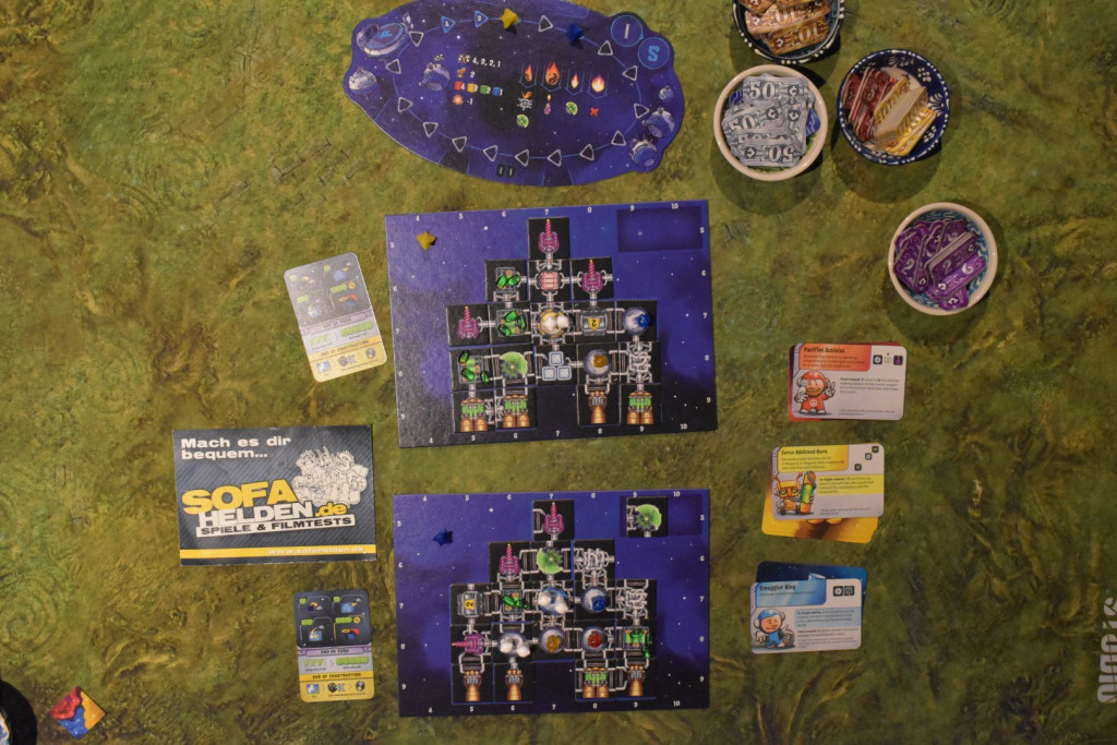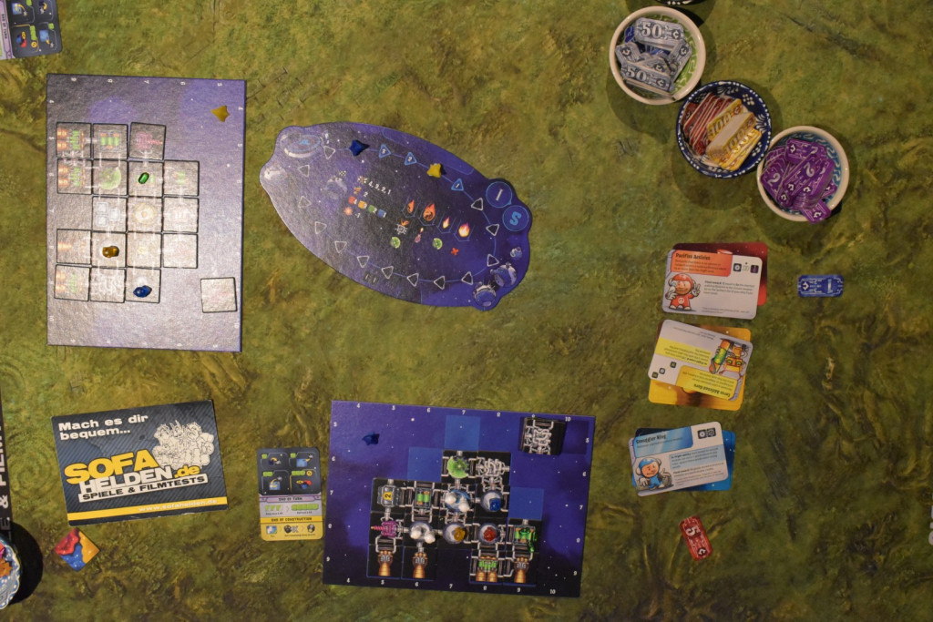 Wir haben uns natürlich dazu entschlossen, alle drei Module zu integrieren. Hierfür mischt Ihr die drei VIP-Stapel nach Ihren Rückseiten und deckt jeweils eine auf. Außerdem mischt Ihr die vier neuen Kabinen mit der speziellen Rückseite und verteilt jeweils eine. Alle legen sie auf das Reservierungsfeld des eigenen Tableaus. Sie ist einfach eine Bonuskabine, die Ihr im Zuge des Raumschiffbaues verwenden könnt. Benutzt Ihr sie nicht, kostet sie Euch - wie aus dem Grundspiel gewohnt - einen Credit. Dann legt Ihr die Übersichtskarten für den rundenweisen Raumschiffbau so aus, dass sie für alle gut sichtbar sind. Außerdem benötigt Ihr einen Würfel und das Missionsheft. Aus letzterem sucht Ihr Euch eine Mission aus und spielt sie in einer Stufe Eurer Wahl. Alternativ könnt Ihr auch die Missionskarten mischen und eine zufällige ziehen. Mit dieser kommt meistens noch zusätzliches Material dazu. Ansonsten baut Ihr alles wie gewohnt auf und lasst die Sanduhren in der Schachtel. Beim rundenweisen Aufbau Eurer Schiffe nehmt Ihr Euch, je nach Startposition, Warenwürfel in Eurer Farbe. Dabei bekommt die Person die als letztes an der Reihe ist acht Würfel. Die übrigen erhalten gegen den Uhrzeigersinn jeweils einen Würfel weniger, sodass die Person, die das Spiel beginnt, am wenigsten Würfel zur Verfügung hat. Dann kann es auch schon losgehen.