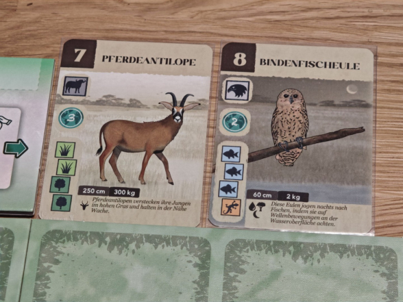Spielt man eine Wildniskarte aus Deck B oder Deck C, also ein Tier, so muss man zunächst prüfen, ob alle Voraussetzungen erfüllt sind, um das Tier ins eigene Reservat aufzunehmen. Hat man alle Tierarten oder Produzenten in der benötigten Kombination und Anzahl bereits ausliegen, und erfüllt man ggf. die Schutzvoraussetzungen, so darf auch die gespielte Tierkarte ins Reservat aufgenommen werden. Hat man die benötigten Produzenten oder Tiere nicht ausliegen oder erfüllt die Schutzvoraussetzungen nicht, muss die Karte in die Auffangstation. Aber Achtung: hier dürfen nur maximal drei Karten liegen. Sobald zu einem späteren Zeitpunkt alle Voraussetzungen einer Wildniskarte in der Auffangstation erfüllt werden, wandert sie direkt und automatisch ins Reservat, ohne dass hier eine extra Aktion notwendig wäre. Die Auffangstation ist also eine praktische Pufferzone.