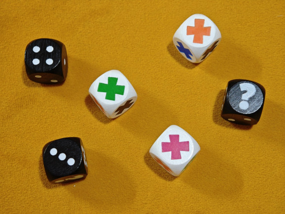 Zuletzt kommen noch die sechs sechsseitigen Würfel in die Tischmitte: drei Zahlenwürfel und drei Farbwürfel. Die Zahlenwürfel zeigen Werte von 1 bis 5 sowie ein Fragezeichen; die Farbwürfel zeigen X-Symbole in fünf verschiedenen Farben sowie ein schwarzes X. Das Fragezeichen und das schwarze X fungieren jeweils als Joker und können als beliebige Zahl bzw. beliebige Farbe verwendet werden.