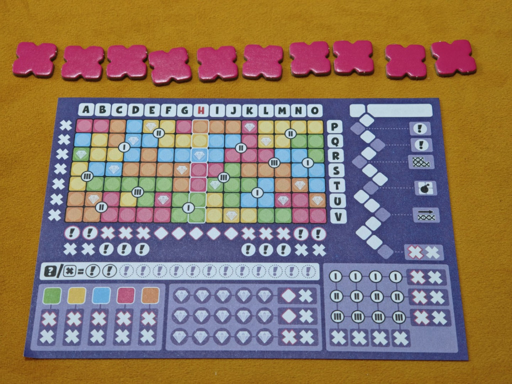 Dieses Wettrennen gibt es auch beim Erreichen von drei anderen Zielen: dem Abschließen von Farben, dem Sammeln von Diamanten und dem Werten von Kreuzungspunkten. So darf der erste Spieler, der alle Felder einer Farbe angekreuzt hat, zwei X-Chips umdrehen, alle weiteren nur einen. Zudem sind im Raster Diamanten verteilt. Immer wenn man ein Feld mit Diamanten ankreuzt, darf man auch das nächste Feld im Diamanten-Bereich auf dem Blatt markieren. Hat man eine Reihe vervollständigt – dafür braucht man jeweils fünf Diamanten – darf man einen X-Chip umdrehen; schafft man es als Erstes, gibt es einen zusätzlichen Bonus wie ein Kreuz auf der Passleiste oder einen zweiten X-Chip.