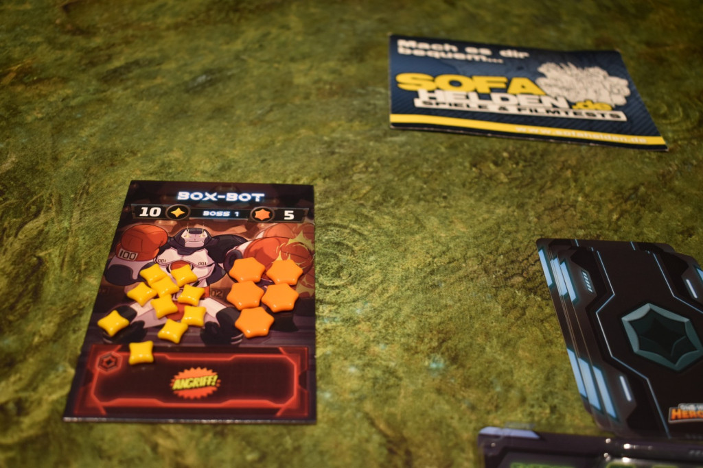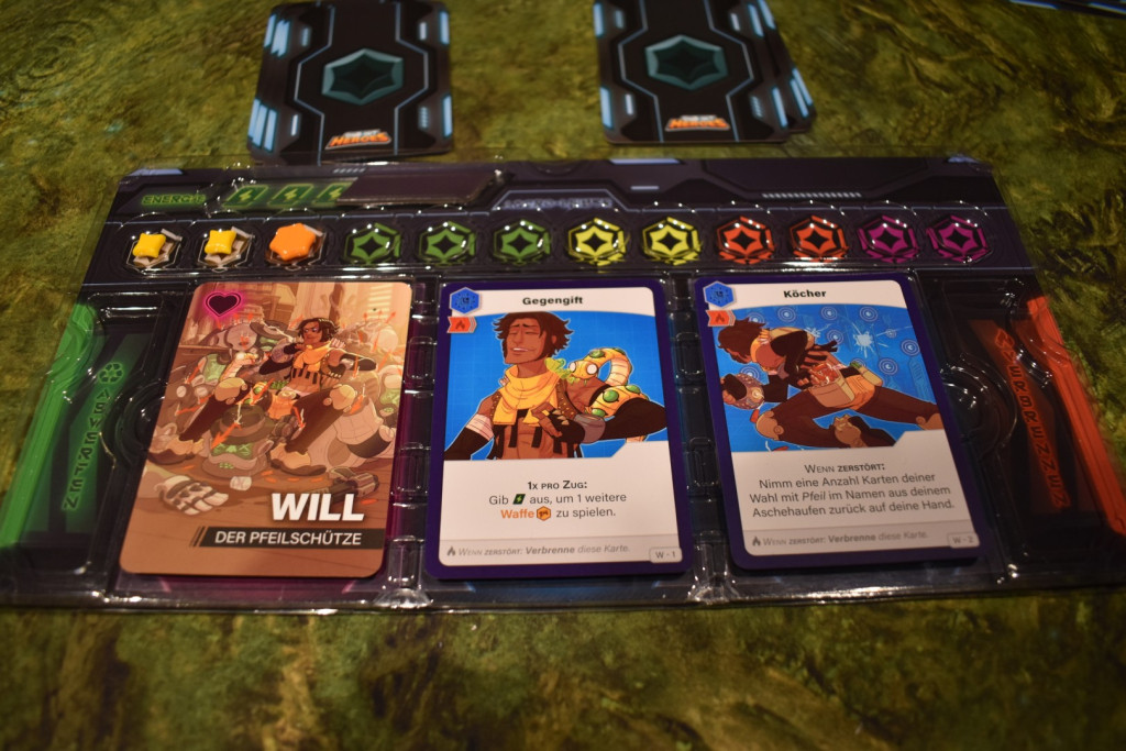 Für den Spielaufbau müsst Ihr Euch erst einmal für eine Episode entscheiden. Das Spiel enthält zwei Episoden mit jeweils vier Bossen. Im Regelfall fangt Ihr mit Episode eins an. Ihr nehmt Euch das Boss-Tableau, lest die Rückseite (das solltet ihr in jedem Fall tun!) und nehmt Euch alles weitere benötigte Material. Hierzu gehört in der Regel das Kartendeck des Bosses (nicht mischen!) und die Schadensmarker, die Ihr auf sein Tableau legt. Anschließend nehmt Ihr Euch jeweils ein Tableau und einen Charakter mit dazugehörigem Deck. Die Charakterkarte legt Ihr auf Euer Held-Feld und zwei eurer Ausrüstungskarten auf die entsprechend markierten Bereiche Eures Tableaus. Auf eure Aggroleiste legt Ihr drei Schadensmarker, sodass die drei weißen Felder verdeckt sind. Dies ist Eure Aggro am Anfang eines Bosskampfes. Anschließend legt Ihr noch den Energieanzeiger so auf Eure Energieleiste, dass Ihr alle drei Energiesymbole seht. Die beiden Würfel legt Ihr in die Tischmitte und bestimmt eine Person, die anfängt. Bevor es nun losgeht mischt Ihr noch Eure Decks und zieht jeweils fünf Karten auf die Hand.