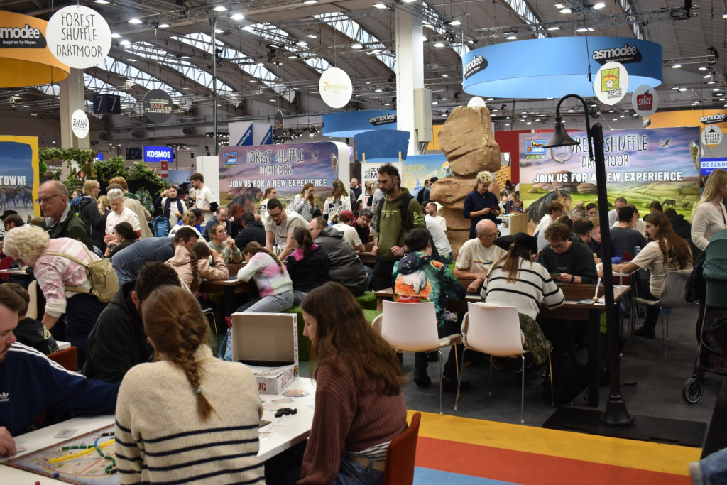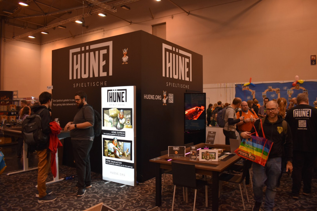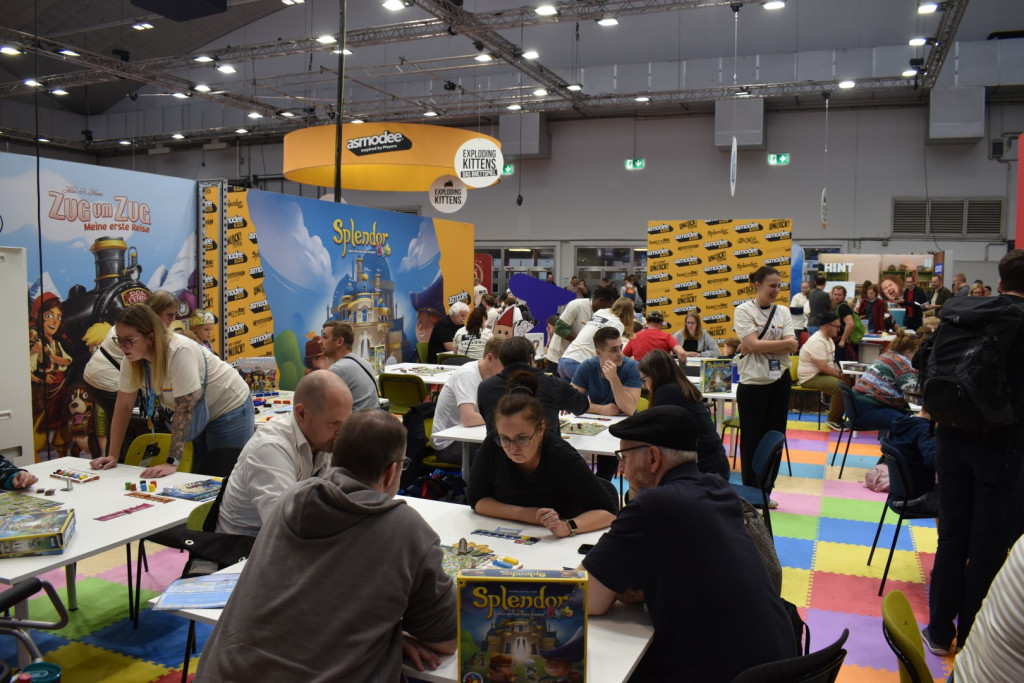 Mittlerweile ist es eine gute Stunde später und wir schlendern in Richtung Halle 3, denn hier steht ein Presseevent an. Wir schnuppern kurz rein, bevor wir in weitere Termine gehen und dabei feststellen: Der Unterschied zwischen Halle 6/7 (Familienspiele) und Halle 3 (Expertenspiele) ist gigantisch. Während man in den ersten Hallen relativ gut laufen kann, muss man in Halle 3 einen auf Lightning McQueen in der Traktorszene machen: Lücke suchen und mit Vollgas drauf zusteuern oder sich in der Masse treiben lassen. Mittlerweile hat sich der erste Eindruck etwas gewandelt: Man realisiert, wie groß die Messe ist und wie viele Leute die angestrebten 220000 Messebesucher*innen in 4 Tagen eigentlich sind. Trotzdem sind wir dazu gekommen noch einige gute Gespräche mit Verlagen zu führen und uns dort Spiele zeigen zu lassen.