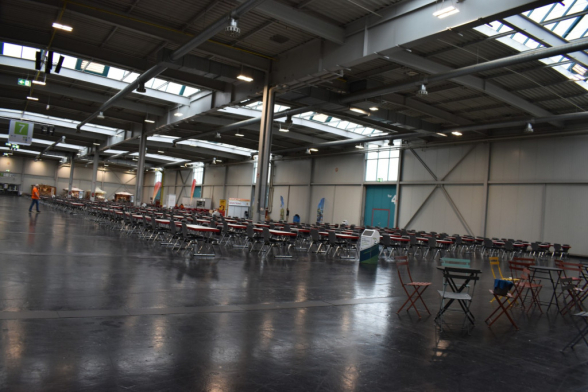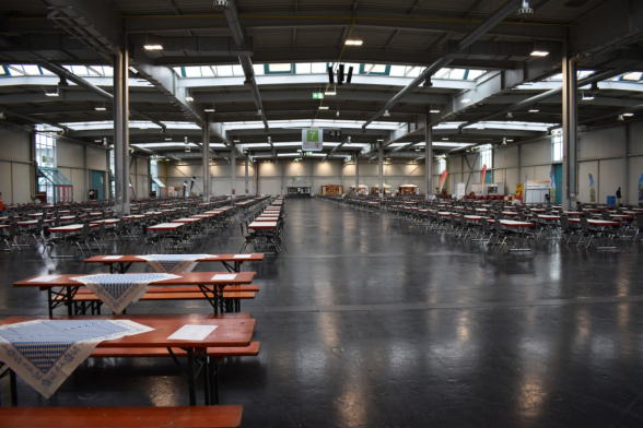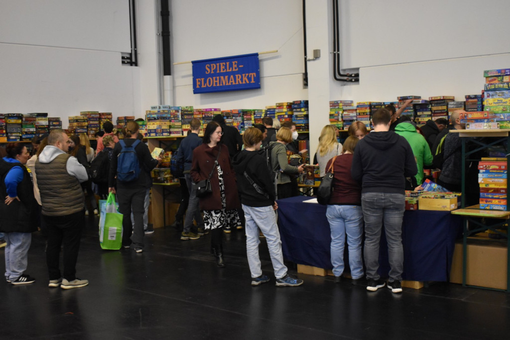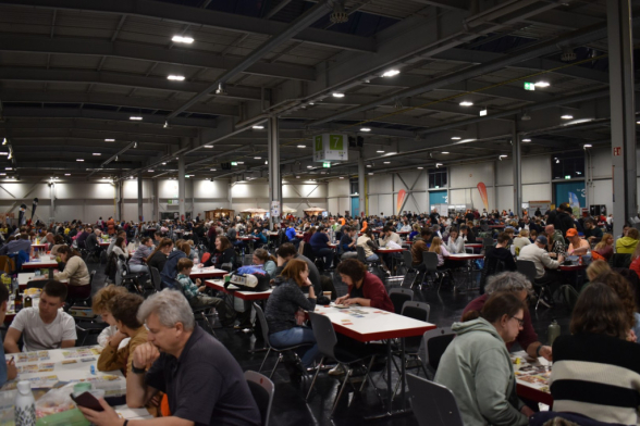 Tag 2 bedeutete nicht nur für uns mehr Personen, mit denen wir spielen „mussten“, sondern auch mehr Besucher für die Spielwiesn. Man merkte schon direkt beim Einlass: heute ist deutlich mehr los. Anders als am ersten Tag entschied sich die Security auch dazu, die Tickets der Besucher*innen schon einzuscannen und alle vor den Hallen zu sammeln, bevor die Türen zu ebendiesen geöffnet werden. Nachdem die Messe offiziell eröffnet war, mischten auch wir uns unters Volk und schlossen als erstes unsere Bildungslücke bezüglich des originalen 7 Wonders. Anschließend versuchten wir uns an Van Helsing und tauchten ab mit The Crew: Mission Tiefsee. Dann standen wir etwas auf dem Schlauch, was wir spielen sollten. Also drehten wir eine Runde durch die Halle 5, um vielleicht einen Verlagstisch zu ergattern, aber: keine Chance. Somit blieb noch eine Hoffnung: ein größeres Spiel auf der Exklusiv-Fläche zu spielen. Und siehe da: hier konnten wir noch einen letzten Tisch ergattern und das Spiel Thebai anspielen. Letztes Jahr gab es diese Fläche auch schon, doch wir hatten sie noch nicht genutzt. Dieses Jahr war sie größer und wir hatten das Gefühl, dass man hier gut Chancen hat, einen Platz zu ergattern und zu spielen. In unseren Augen eine sehr gute Lösung für die teureren Spiele. Hier waren auch einige Erklärer*innen unterwegs, sodass sich die meist komplexeren Spiele nicht erst durch die Regelstudie in die Länge zogen. Auch dieses Jahr wurden etwa gegen Mittag weitere Spielflächen eröffnet. Dieses Mal wurde Halle 4 hinzugefügt und mit Tischen und Bänken ausgestattet.