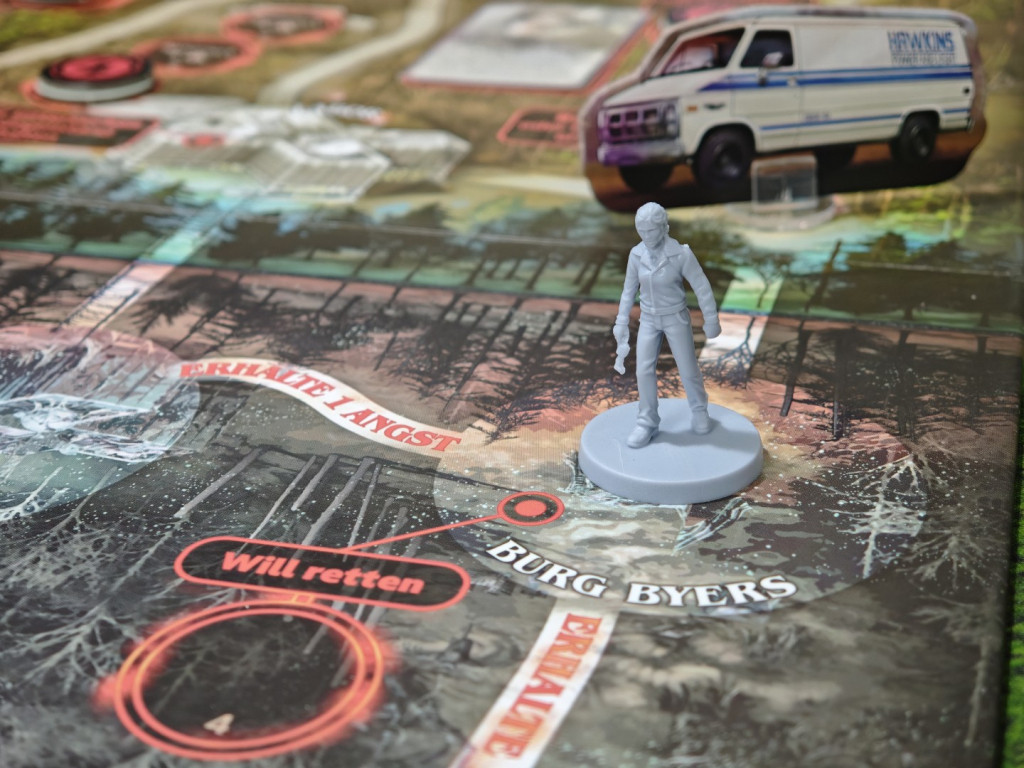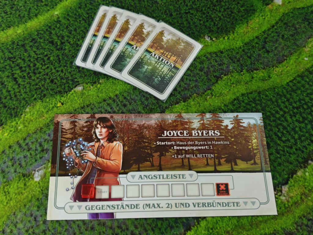 Zuletzt wählen die Spieler jeweils einen Charakter. Man hat die Wahl zwischen den Kids Lucas Sinclair, Mike Wheeler, Dustin Henderson und Nancy Wheeler sowie den Erwachsenen der Serie Jim Hopper und Joyce Byers mit jeweils einzigartigen Sonderfähigkeiten. Hat man sich entschieden, nimmt man sich die Miniatur und das Tableau des entsprechenden Charakters. Auf das Tableau wird ein Angstmarker auf das Startfeld der Angstleiste platziert. Das sind quasi die „Lebenspunkte“, denn erreicht der Angstmarker das letzte Feld, ist ein Charakter hinüber. Die Miniatur wird auf den Spielplan gestellt: Jeder Charakter startet auf einem anderen Ort des Spielplans, wie auf dem Charaktertableau angegeben. Zuletzt wird die Elfi-Miniatur auf das erste Feld der Ereignisleiste des Spielplans platziert. Sie hat nur drei Felder.