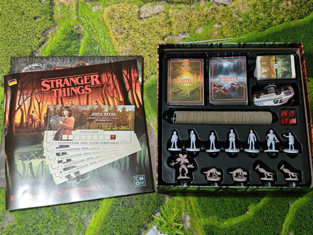 Das Highlight in Stranger Things sind zweifellos die Miniaturen – wenig überraschend, da der Verlag CMON (Cool Mini Or Not) dahintersteckt. Sowohl die Charaktere als auch die Gegner kommen als graue Plastikfiguren daher. Der Detailgrad ist zwar nichts Außergewöhnliches, aber die Charaktere und der Demogorgon sind absolut treffend zu erkennen. Schöne Sache! Bei uns war leider der Kopf des Demogorgon abgebrochen, aber etwas Sekundenkleber hat das Problem schnell gelöst. Daneben besteht das Spielmaterial hauptsächlich aus Karten. Die Spielertableaus sind leider nur aus etwas dickerem Papier, dafür macht der Spielplan optisch einiges her.
