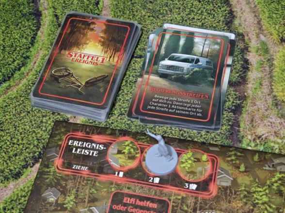 In Staffel 1 gibt es fünf Aktionen mit Probe. In der Schule und im Haus der Byers kann man „Rekrutieren“. Bei Erfolg darf man sich die entsprechende Verbündeten-Karte nehmen, die fortan durch ihre Sonderfähigkeit deine Erfolgschancen massiv erhöhen wird. Hoffentlich. Das Labor in Hawkins kann man „untersuchen“, um in Zukunft immer ein zusätzliches Ausrufungszeichen auf Aktionskarten ignorieren zu können – Ausrufungszeichen sind schlecht und erhöhen die Anzahl zu ziehender Ereigniskarten am Zugende. Eine besonders wichtige Aktion, die strategisch clever eingesetzt werden sollte, ist „Elfi helfen“. Gelingt die Probe, darf man eine in der aktuellen Partie noch nicht genutzte Kraft von Elfi triggern. Dabei stehen im Labor in der Schattenwelt und im Haus der Wheelers jeweils drei verschiedene Kräfte zur Verfügung, deren Verwendung spielentscheidend sein kann. Elfi wäre nicht Elfi, wenn sie sich nicht revanchieren würde. Dann wäre noch die Aktion, auf die man während der gesamten Partie hinarbeitet: „Will retten“. Diese gibt es an drei verschiedenen Orten. Erst wenn die entsprechende Probe an allen drei Orten gelungen ist, gewinnt man die Partie.