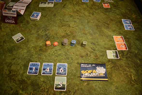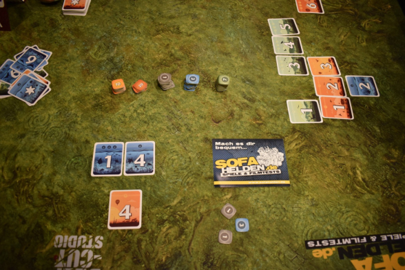 Sobald Karten in Eurer Auslage liegen, dürft Ihr sie zwar umsortieren, aber nicht mehr drehen. Dabei wisst Ihr aber vor dem Umdrehen zumindest ungefähr, was sich auf Ihrer Rückseite befindet: Die Farbe der Rückseite entspricht niemals der Vorderseite. Eine blaue Karte ist also auf der Rückseite immer orange oder grün. Außerdem ist auf der Rückseite der Karte immer die andere Punktzahl aufgedruckt. Habt Ihr also auf der Vorderseite drei Punkte, so ist auf der Rückseite ein Punkt. Bei den Zahlenwerten ist es etwas anders. Die Rückseite ist immer um eins größer oder kleiner. Also beispielsweise beim Sonderfall der Sechs ist auf der Rückseite entweder eine Eins (plus eins) oder eine fünf (minus eins).