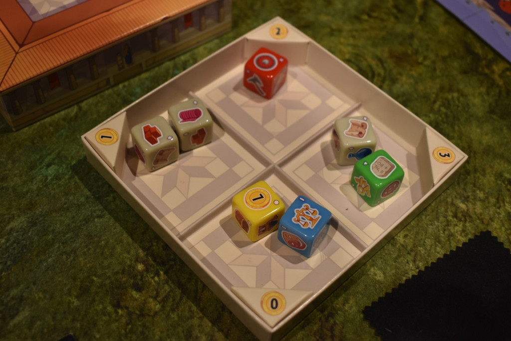 Zu Beginn einer Runde verschließt Ihr das Forum und bewegt es in kreisförmigen Bewegungen über den Tisch. So würfelt Ihr. Dann nehmt Ihr den Deckel ab und findet die Würfel in den vier Fächern vor. Diese zeigen Euch jeweils die Würfelkosten an.