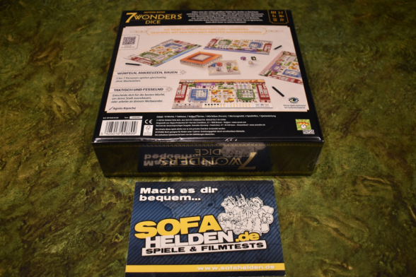 Wie bereits erwähnt, haben wir keinerlei Erfahrungen mit 7 Wonders, daher können wir hier keinen Vergleich ziehen. Beim asmodee Presseevent spielten wir die erste Partie mit einem Pärchen, das 7 Wonders schon kannte. Bei den beiden haben wir gemerkt, dass es für erfahrene Spieler nicht so einfach ist, die Unterschiede zum Grundspiel zu verstehen. Apropos verstehen: Das Spiel an sich ist echt super. Es ist nicht sonderlich schwer, hat keine Plastikstifte oder Abreißblöcke und macht einfach Spaß. Aber die Anleitung ist in unseren Augen unvollständig. Gerade die Kaserne ist nicht ausreichend erklärt und die Kreuze bei den Bonusfeldern müssten auch etwas präziser erklärt werden. Auch der Widerspielwert ist relativ hoch, da durch die Würfel jede Runde anders ist und - das wird Vielspieler freuen - die Tableaus sind alle unterschiedlich. Trotzdem scheint das Balancing zu passen. Am Ende kommen wir so auf eine sehr gute Wertung von 8 Punkten, bei denen die Anleitung bereits einen Punkt gekostet hat.