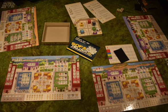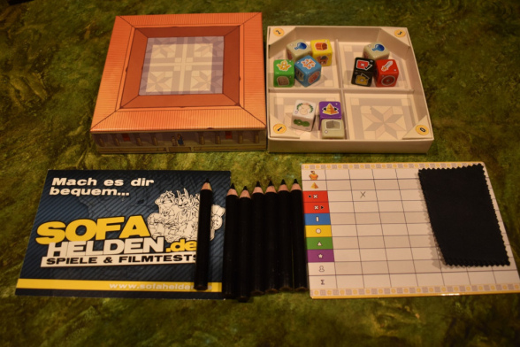 Für den Spielaufbau nehmt Ihr Euch jeweils eine Spieltafel, ein Tuch und einen Stift. Ihr öffnet das Forum und legt bis auf den weißen, schwarzen und lila Würfel alle hinein. Die Übersichten legt Ihr parat, so dass sie von allen gesehen werden können. Dann kann es auch schon losgehen.