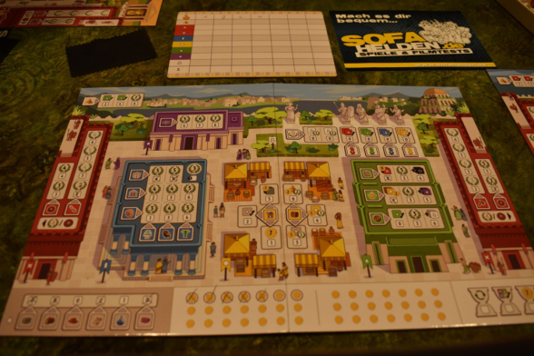 Beim Bauen habt Ihr die Wahl zwischen fünf Gebäuden. Die Agora, der Markt und die beiden Kasernen. Für den Bau dieser benötigt Ihr den Würfel der entsprechenden Farbe mit einem Symbol, das zu Euren Plänen passt. Bei der Agora müsst Ihr die Zeilen und Spalten immer in Pfeilrichtung ankreuzen, immer in der Zeile oder Spalte, die das Symbol des Würfels zeigt. Darüber hinaus erhält die Person, die die Agora als erste vollständig gebaut hat, das Bonuskreuz mit drei Siegpunkten. Auch bei den Kasernen müsst Ihr die Reihenfolge beachten. Entsprechend der Symbole kreuzt Ihr die Spalten von unten nach oben an. Dabei unterscheidet Ihr zwischen Angriff und Verteidigung. Greift Ihr mit der Kaserne-West die Person links von Euch an, prüft Ihr, wie viele Kreuze sie bei Ihrer Verteidigung gesetzt hat. Diese zieht Ihr von Euren soeben angekreuzten grauen Siegpunkten ab und schreibt das Ergebnis in das Feld. Ebenso verhält es sich mit der Kaserne-Ost und der Person rechts von Euch. Der Markt ist frei ankreuzbar, sofern Ihr das mit dem Feld gewürfelte Symbol habt. Er bringt Euch Sofortboni, aber auch Siegpunkte am Spielende. Das letzte Gebäude ist die Akademie. Hier könnt Ihr neben weiteren Boni die drei übrigen Würfel für Euch freischalten. Wichtig ist dabei, dass durch diese Spezialwürfel jeweils ein grauer Ressourcenwürfel entfernt wird. Dadurch erhalten die Anderen weniger Ressourcen und nur die Personen, die die Spezialwürfel angekreuzt haben, dürfen diese auch verwenden. Sie geben euch die Möglichkeit, die Gildenhalle und die Ehrengalerie zu bauen. Hierfür müsst Ihr beim lila Würfel bestimmte Bedingungen erfüllen, wogegen Ihr bei der Ehrengalerie wieder nur Symbole benötigt. Der schwarze Würfel ist hingegen nur dafür da, dass Ihr ein Feld im angezeigten Gebäude ankreuzen dürft.