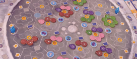 Für den eigentlichen Spielaufbau legt Ihr das Spielbrett in den Karton zurück und setzt euch rundherum. Nun dürft Ihr Euch Eure Farben wählen, wobei es natürlich Sinn ergibt, die zu nehmen, die direkt vor Euch ist. Ihr nehmt Euch Eure Figuren und stellt drei von Ihnen auf Euer Häuschen und eine auf das Startfeld. Wichtig ist dabei, dass die farbige Seite nach oben zeigt. Eine*r von Euch nimmt sich den Kartenstapel und mischt ihn gut durch, um anschließend je fünf Karten an alle auszuteilen. Dann geht es auch schon mit der ersten Runde los.