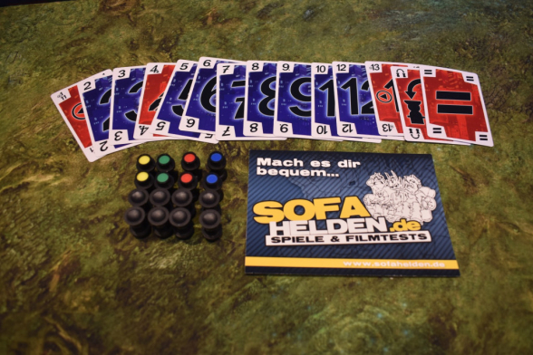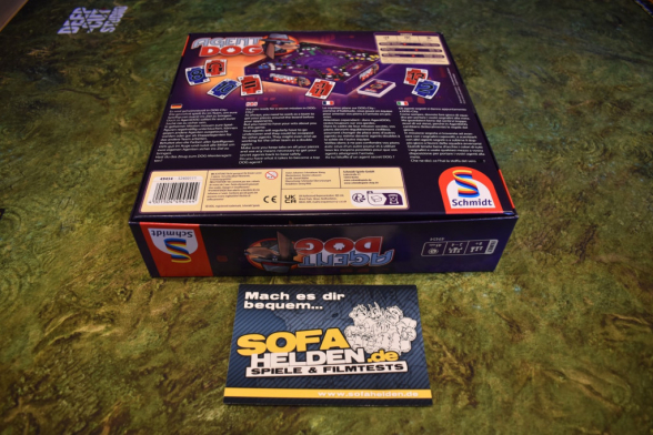 Das Spielmaterial ist gewohnt übersichtlich. Neben einem, umweltfreundlich in Papierbanderolen eingewickelten Kartenstapel gibt es noch die besonderen Kunststofffiguren, die von einer Seite mit einer Farbe versehen sind. Diese sind in einem Zipp-Beutel untergebracht. Das Inlay des Spiels ist X-förmig aus Karton gefertigt. Hier hatten wir schon einen leichten Transportschaden, der sich aber halbwegs ausbessern ließ. Das man weitestgehend auf Plastik verzichtet, finden wir gut, weniger gut jedoch, dass sich die Klebefolie an der Schachtelunterseite nicht ohne Schäden entfernen lies. Oben auf liegt das Spielbrett, das sich durch die gestanzten Felder vom Grundspiel unterscheidet. Das dürfte auch einer der Gründe sein, warum das Spiel nur eine Variante für vier Personen bietet und nicht für Sechs. Natürlich darf auch die mehrsprachige Anleitung nicht fehlen. Die Karten selbst kamen uns dünner vor als bei Dog Deluxe. Es ist ausreichend, aber wir hätten uns hier etwas mehr Material gewünscht. Da die Karten sortiert sind, solltet Ihr sie vor dem ersten Spiel besonders gründlich mischen.