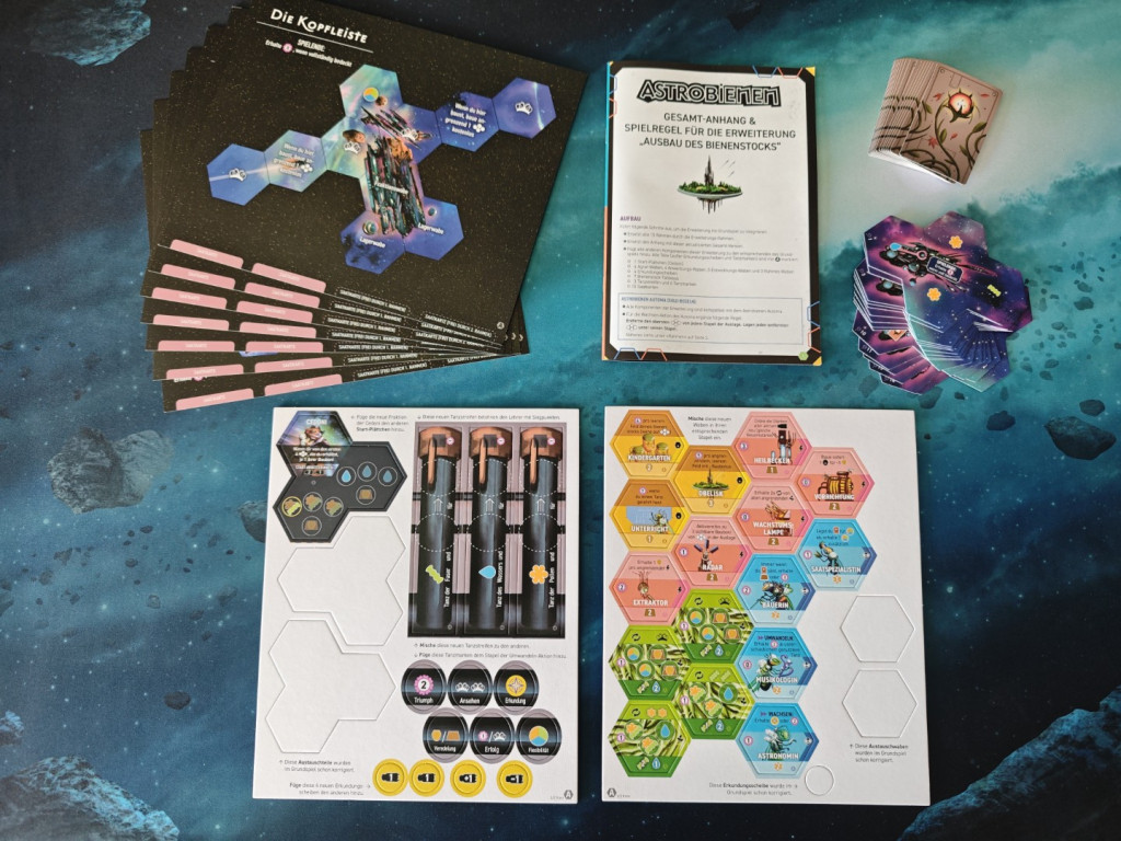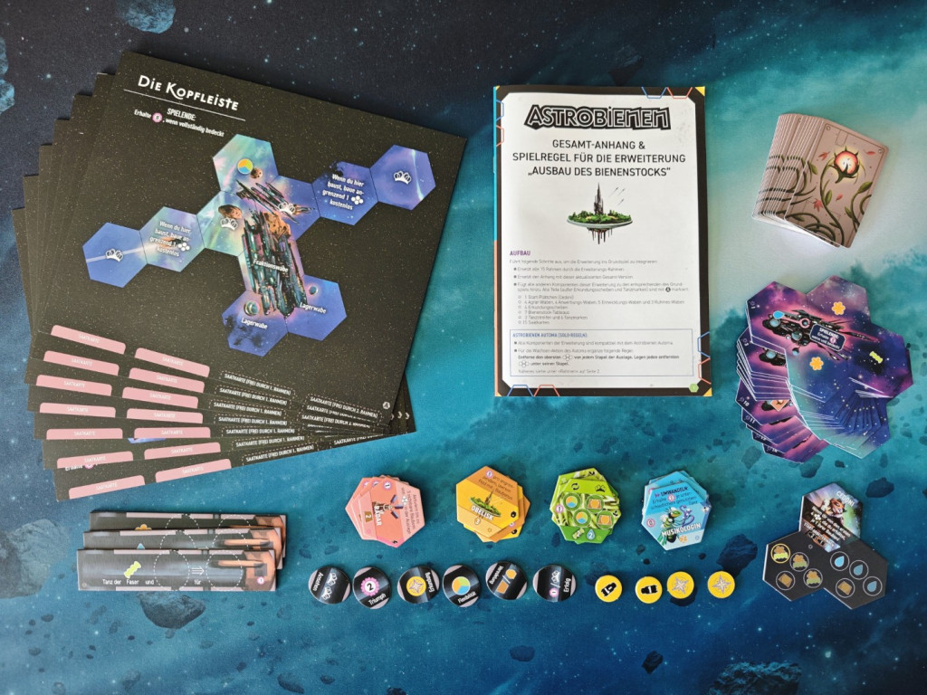Auf den ersten Blick bringt die Erweiterung Ausbau des Bienenstocks jede Menge unterschiedlicher Spielkomponenten mit, die das Potential haben Astrobienen in Umfang und Variabilität stark zu erweitern. Auf den zweiten Blick erkennt man, dass es keine gänzlich neuen Materialien gibt, die Astrobienen um neue Spielmechaniken oder -konzepte erweitern. Die Devise ist also: mehr von Altbekanntem. Schauen wir uns nun an, was die zusätzlichen Komponenten so machen, und ob sich das Spielerlebnis dadurch in eine bestimmte Richtung verändert.
