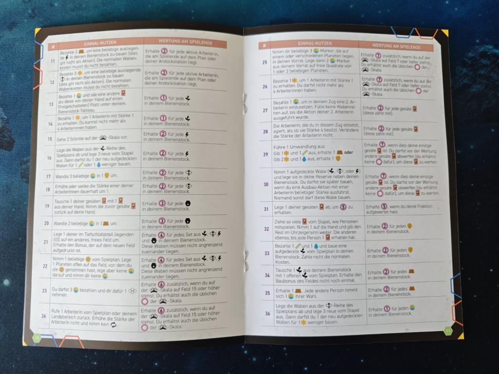 Außerdem gibt es in jeder Kategorie (Agrar, Anwerbung, Entwicklung, Ruhm) mehr Waben zum Erwerben, mit neuen Funktionen. Und zuletzt, was besonders schön ist: Es gibt einen neuen Gesamt-Anhang, der alle Komponenten des Grundspiels und der Erweiterung erklärt. Den alten Anhang kann man also entsorgen.
