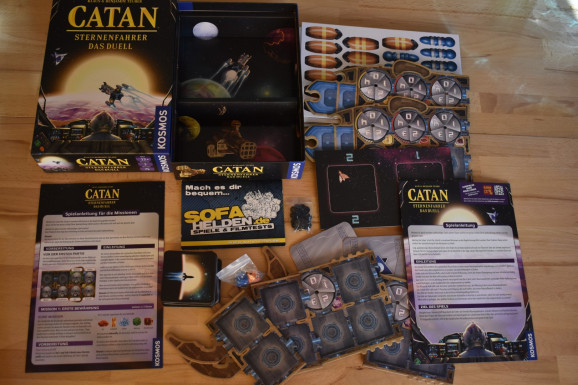 Anders als die Zweispieler-Variante des Originals ist die Verpackung von Catan - Sternenfahrer - Das Duell relativ groß. Das hat natürlich auch seine Gründe: im Inneren befinden sich zwei Sternenschiffe, die erst einmal zusammengepuzzelt werden müssen. Vor der ersten Partie müssen hier mithilfe von Kunststoffnieten noch die Stellräder für die Ressourcen fixiert werden. In einem Stanzbogen findet Ihr außerdem die Ausbauten der Schiffe in Form von Waffen und Antriebsteilen. Darüber hinaus gibt es noch Zentren für die Raumschiffe, die zweimal für die beiden Raumschiffe in Stufe eins und einmal in Stufe zwei aus den Stanzbögen befreit werden müssen. Neben zwei Würfeln und der Anleitung gibt es außerdem noch einen Stapel Karten, der mithilfe einer Papierbanderole zusammengehalten wird. Zu dem Karton-Inlay, das diesen in zwei Bereiche teilt, gibt es noch drei zusammenbaubare Schachteln für die Aufbewahrung des Spielmaterials. Insgesamt ist das Spielmaterial sehr schön geworden. Die Raumschiffe machen sofort Lust auf mehr. Alleine, dass man die Ausbaustufen des Antriebs und der Waffen in die Aussparungen übereinanderlegen kann und alles einwandfrei zusammenpasst macht schon Lust auf mehr.