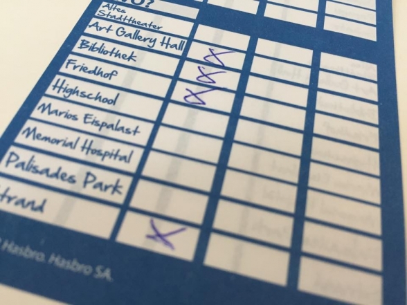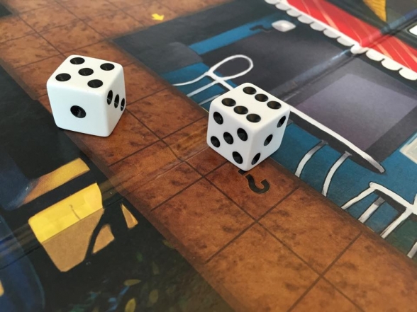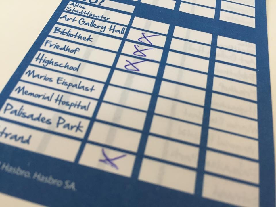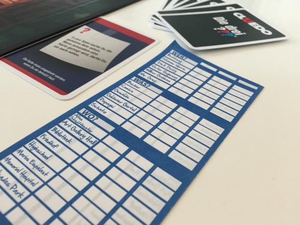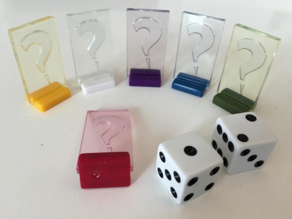 Ansonsten gibt es zwei Würfel, einen Notizblock zum Ankreuzen und sechs Spielfiguren in verschiedenen Farben.