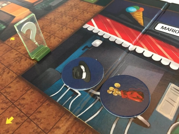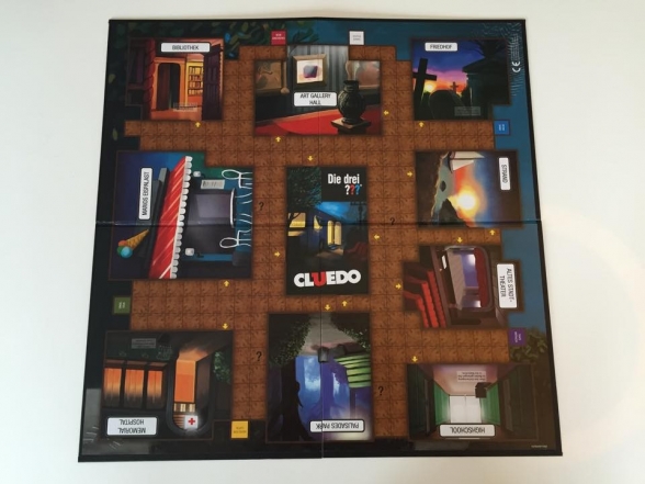 Das Spielbrett von Cluedo: Die drei ??? ist sehr schlicht gestaltet, was aber dem Originalspiel geschuldet ist. Es sind neun verschiedene Orte (z.B. Strand, Bibliothek, Highschool) abgebildet und in der Mitte des Brettes die Zentrale der drei Fragezeichen. Dazwischen gibt es einen braunen Weg in Vierecken eingeteilt und ein paar Symbole. Vergleicht man das Spielbrett mit dem Original, so fällt sofort auf, dass es um einiges schlichter und einfacher gestaltet wurde. Vor allem die Orte wurden ein wenig lieblos auf das Spielbrett geklatscht – schade!