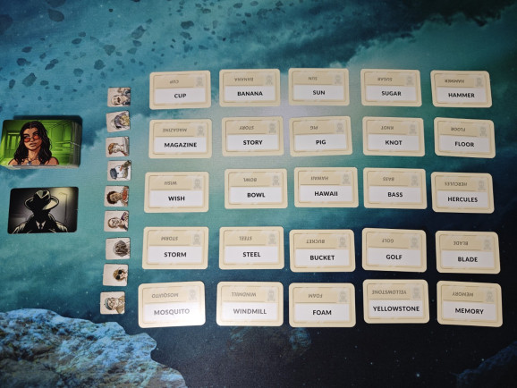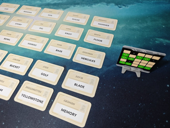 Wie unterscheidet sich nun die Spielvorbereitung? Wie auch im Original wird ein 5 x 5 Raster aus Wortkarten ausgelegt. Daneben kommen die 15 grünen Agenten-Plättchen, das Assassinen-Plättchen und (statt der Plättchen für Unbeteiligte) die 9 kleineren Zeit-Plättchen, welche auf der Rückseite Unbeteiligte zeigen.