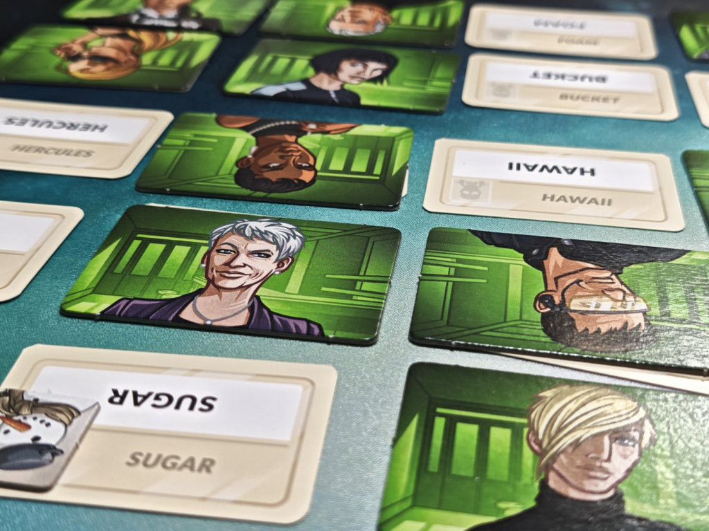 Ein wesentlicher Unterschied zu Codenames ist die Schlüsselkarte, die nun doppelseitig ist und mithilfe des Aufstellers in die Tischmitte gestellt wird. Die Teams müssen sich gegenübersetzen und dürfen nur ihre Seite der Schlüsselkarte sehen. Auf jeder Seite gibt es neun (grüne) Agenten, drei (schwarze) Assassinen und 13 (beige) unbeteiligte Wörter zu sehen, die unterschiedlich verteilt sind, sich aber alle auf dasselbe ausliegende 5 x 5 Wortraster beziehen.