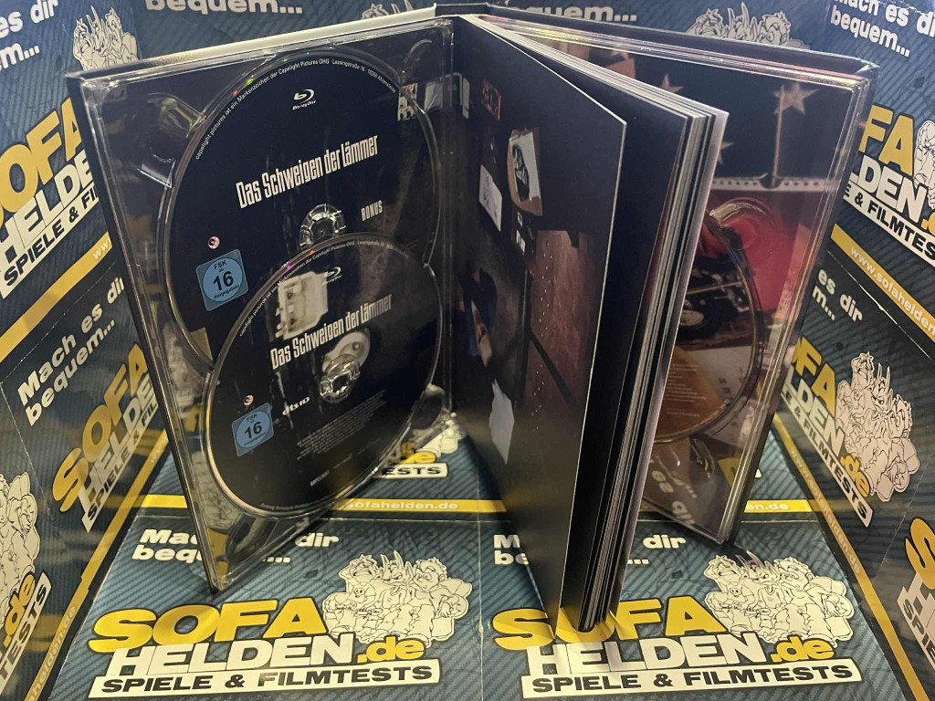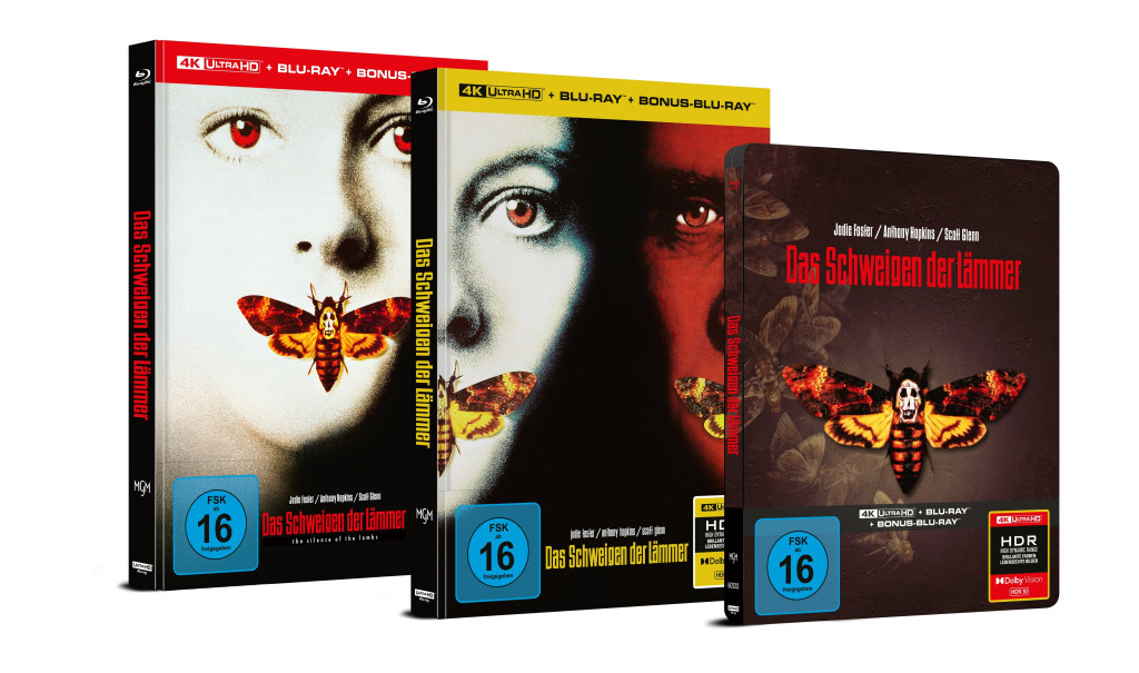 Capelight hat sich für zwei Covervarianten entschieden. Cover A zeigt das ikonische Kinoplakat mit Jodie Foster und dem Totenkopfschwärmer über ihrem Mund, veredelt mit einem Glanzeffekt auf Titel und Motiv. Auf der Rückseite befindet sich eine Filmszene, während die Details auf einer losen J-Card stehen. Im Inneren sind ein 50-seitiges Booklet mit Bildern und einem Text von Alexandra West sowie die 4K-UHD und beide Blu-rays (Film und Extras). Cover B ist exklusiv im Capelight-Shop erhältlich und zeigt Anthony Hopkins und Jodie Foster gemeinsam – natürlich ebenfalls mit dem markanten Totenkopfschwärmer.