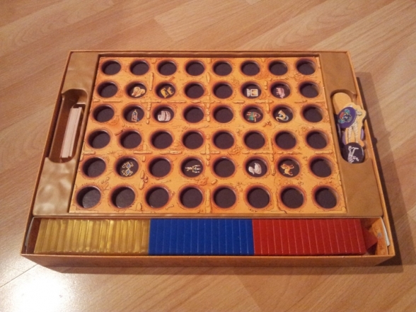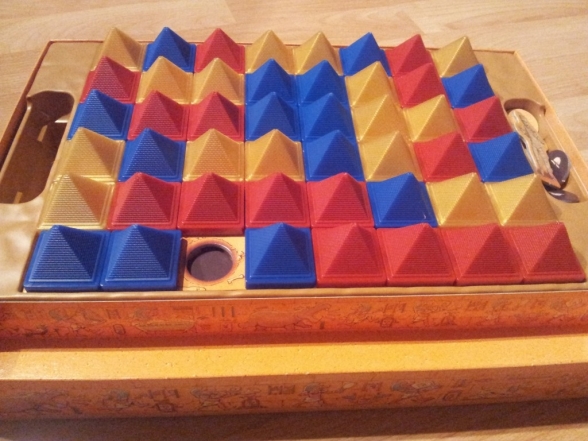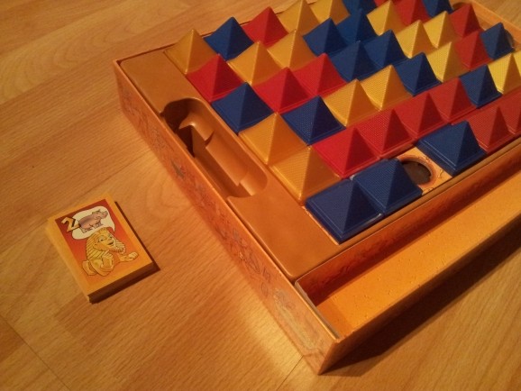 Variante 1: Das Basisspiel Jede Spielvariante bedarf einer Vorbereitung. Im Fall des Basisspiels werden zunächst die Suchkarten nach der Ziffer auf der Rückseite sortiert, gemischt und dann als ein Suchstapel abgelegt, wobei die Karten mit der Ziffer 3 unten, die mit der Ziffer 1 obenauf liegen. Danach werden die Schatztafeln auf dem Kunststoffeinsatz verteilt, die Position und Verteilung ist völlig frei wählbar und sorgt dadurch für jede Menge Abwechslung im Ablauf des Spiels. Anschließend wird die Spielfläche darüber gelegt und die Pyramiden darauf verteilt, wobei in der Basis-Variante wiederum die Verteilung völlig willkürlich erfolgen kann. Das letzte freie Feld darf dabei jedoch keinen Schatz zeigen. Zum Abschluss wird die oberste Karte des Suchstapels umgedreht. Nun kann das Spiel beginnen.