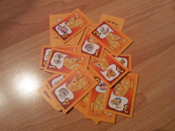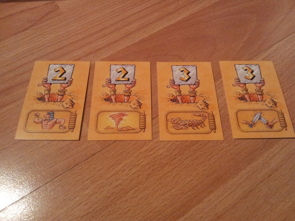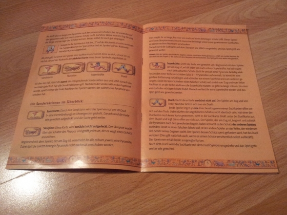 Sonderkarte 2: Der Skorpion Die Karte mit dem Skorpion wird zunächst nicht aufgedeckt. Alle Mitspieler müssen nun jeweils eine Pyramide bewegen, und zwar so lange bis ein beliebiger Schatz dabei freigelegt wird. Der Spieler der den Schatz gefunden hat muss nun einen seiner gewonnenen Schätze an seinen rechten Mitspieler abgeben. Danach wird die Karte mit dem Skorpion aufgedeckt und das Spiel geht weiter.