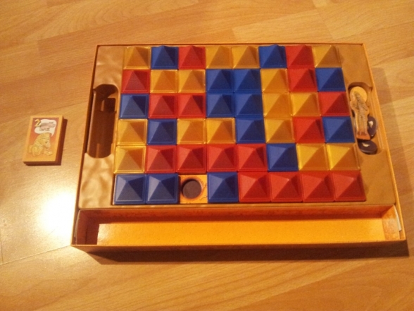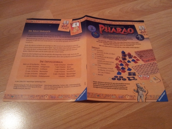 Noch vor dem Öffnen des Kartons fällt einem das witzige Design ins Auge und sorgt für ordentliche Vorfreude. Ein Spielbrett sucht man bei Der zerstreute Pharao vergebens, denn dieses ist in den Karton integriert und benötigt somit einen Platz von ca. 37x27cm auf dem Tisch. Neben der herausnehmbaren Spielfläche gibt es im Inneren noch jeweils eine Ablagefläche für die 30 Suchkarten, die 21 Chips sowie die Pyramidensteine in drei Farben. Die Schatzkarten finden unter der Spielfläche Platz. Sowohl die Chips als auch die Schatzkarten müssen vor dem ersten Spiel vorsichtig aus Stanztafeln herausgelöst werden. Dabei sollte man darauf achten, nicht aus Versehen die Spielfläche mit zu entsorgen. Sowohl die Karten als auch die Chips und die Spielfläche sind aus fester, stabiler Kartonage gefertigt, die Pyramiden sind aus Plastik und machen ebenfalls einen soliden Eindruck. Insgesamt ist die gesamte Verarbeitung sehr gut und weiß zu überzeugen.