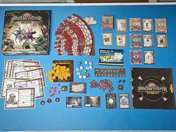 Dungeon Fighter bietet einiges an Spielmaterial: jede Menge humorvoll gestaltete Monster- und Ausrüstungskarten, die individuellen Würfel und natürlich die große Zielscheibe. Besonders gelungen fanden wir die Lebenspunktemarker, kleine Plastik-Herz-Miniaturen. Die Goldmünzen sind aus gelbem Plastik, was man sich unserer Meinung nach hätte sparen können; dicke Pappmarker hätten schöner designt werden können. Dennoch, insgesamt ein Plus für die Komponenten. Und alles passt hervorragend ins Plastik-Insert, ein Benefit, das insbesondere bei der Preisklasse von ca. 40 EUR häufig fehlt.